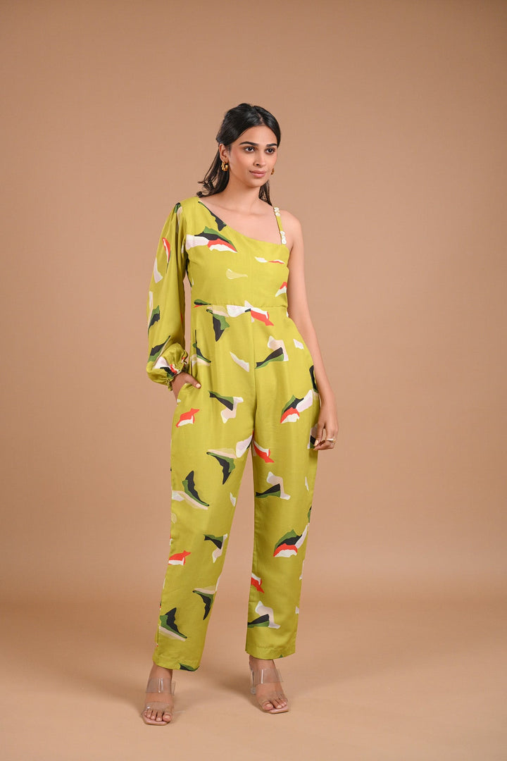 Introducing our one-shoulder printed jumpsuit - a stylish and comfortable piece that's perfect for any casual occasion. Crafted from breathable rayon, this jumpsuit boasts a relaxed fit with a flattering A-line silhouette. The bold, abstract print adds a touch of personality, while the one-shoulder strap with a long puff sleeve adds a touch of elegance. It's the perfect choice for warmer weather, and can be dressed up or down depending on the occasion. Pair it with heels and statement earrings for a night out, or dress it down with sandals and a denim jacket for a casual daytime look.