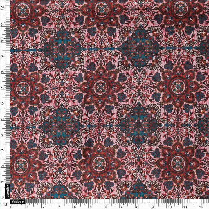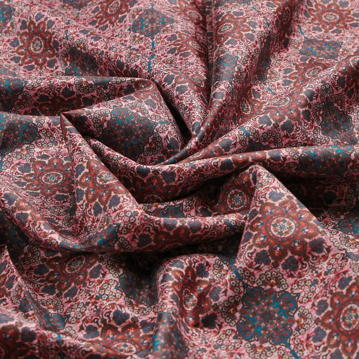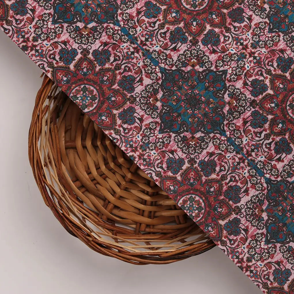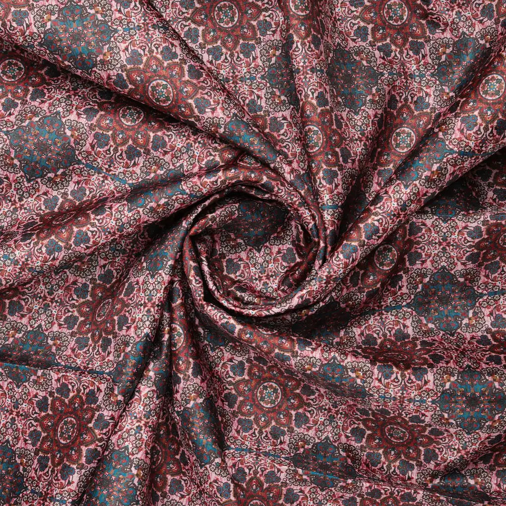This Dola Silk printed fabric material is made from Polyester. It features a beautiful pink color with a traditional paisley and floral print. This fabric is perfect for creating a variety of clothing items, such as dresses, tops, skirts, and sarees. It can also be used for home decor purposes, such as making curtains, tablecloths, and cushion covers. The fabric is medium weight and easy to work with. It is machine washable and has a soft, comfortable feel. This beautiful and versatile fabric is sure to add a touch of elegance to any project.