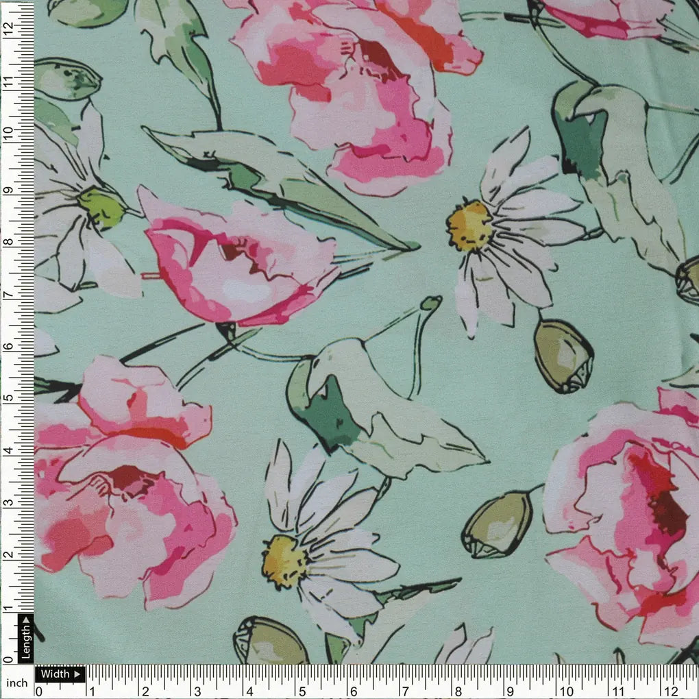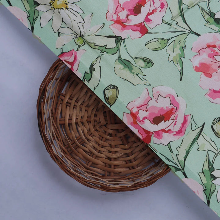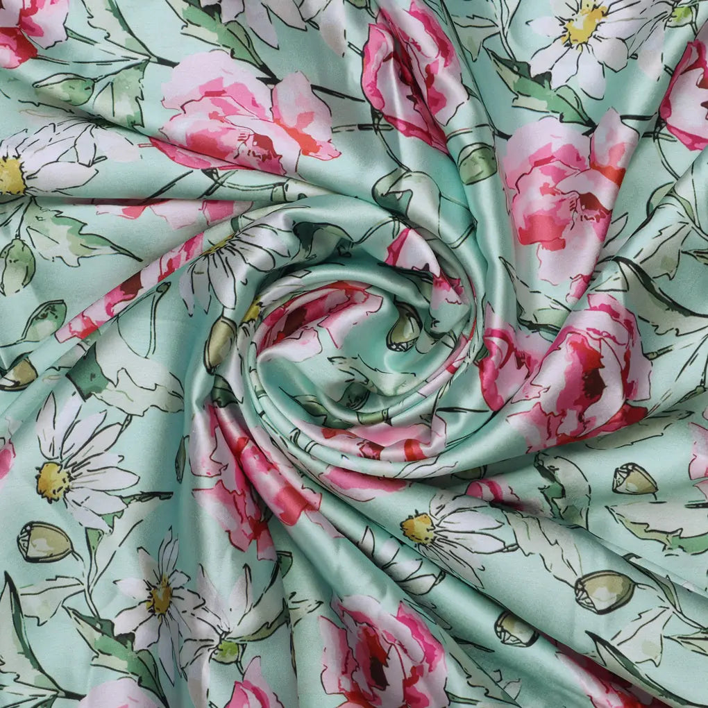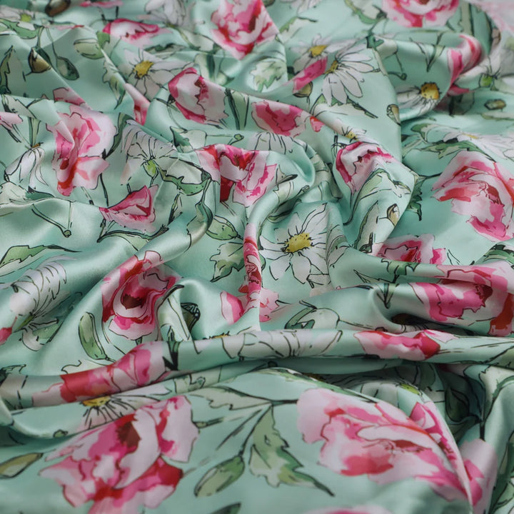 This beautiful pink floral print on japan satin is perfect for your next sewing project. The fabric is soft and lightweight, with a slight sheen. The print features a variety of pink flowers, including roses, peonies, and daisies. The flowers are set against a light green background.