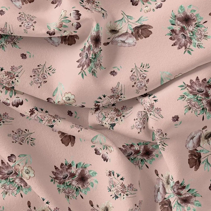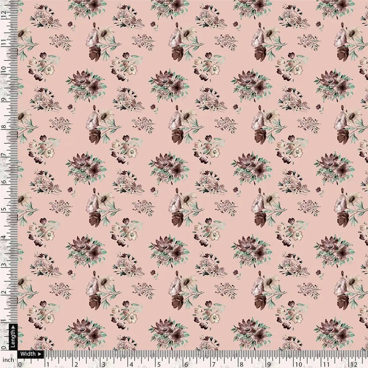 Multi Flower Bunch And Linear Leafs Digital Printed Fabric - Muslin