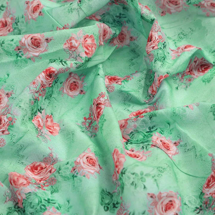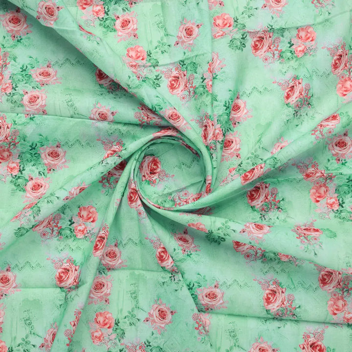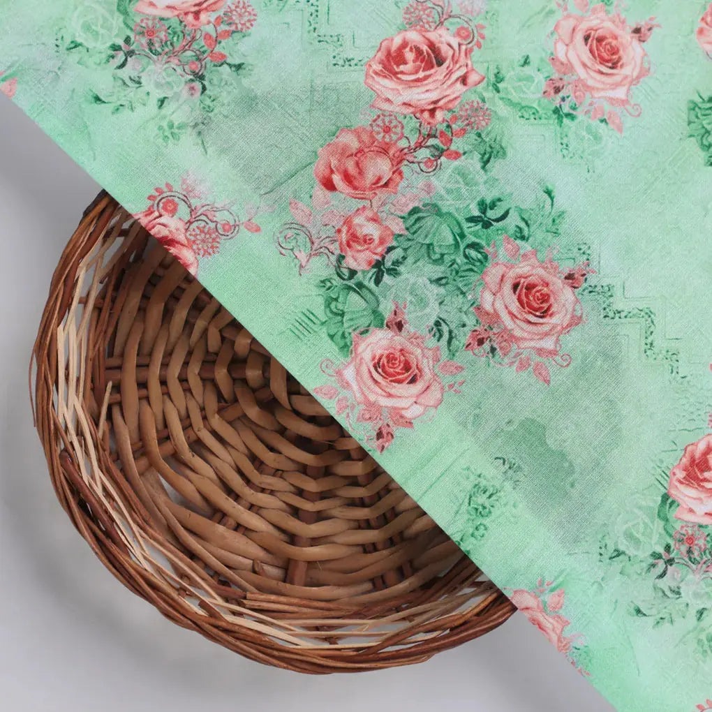 Pink Roses With Pista Background Roses Digital Printed Fabric - Pure Cotton