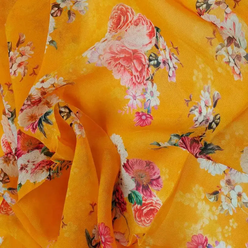 Looking for a beautiful fabric to add to your wardrobe? Look no further than FAB VOGUE Studio's Yellow Base Floral Bunch Pure Georgette Western Wear Printed Fabric. This fabric is made from pure georgette of the highest quality, giving it a luxurious feel. The vibrant yellow base is adorned with a beautiful floral print, perfect for adding a touch of elegance to any outfit. Whether you're looking for something to wear to a special occasion or just to jazz up your everyday wardrobe, this fabric is sure to make a statement.