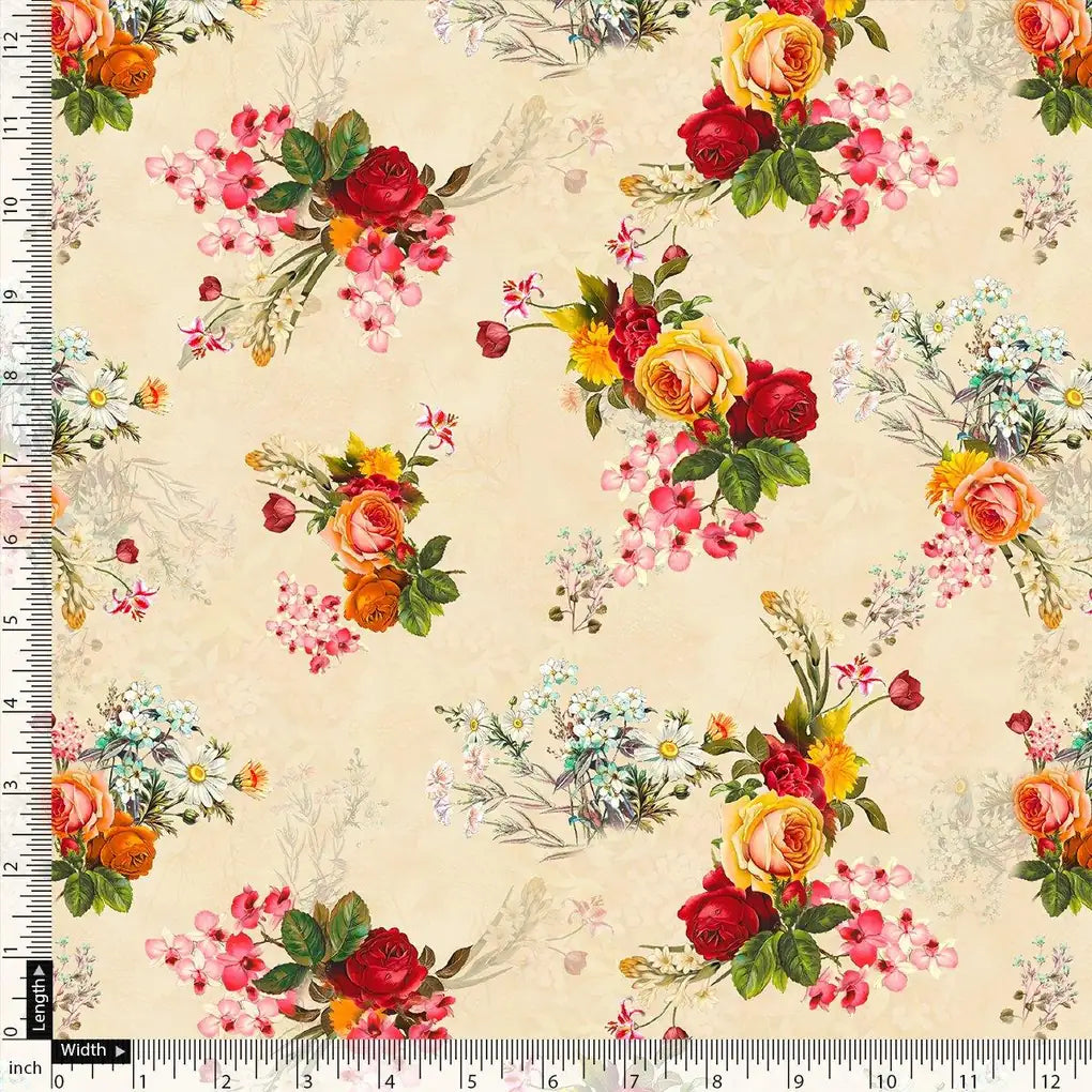 Multicolour Red And Yellow Roses Digital Printed Fabric - Cotton