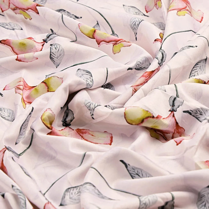 This delicate floral printed polyester fabric boasts a charming pink and white color palette with intricate floral and leaf designs. Its lightweight and smooth texture makes it ideal for creating flowing dresses, breezy tops, and stylish skirts. The subtle yet vibrant floral print adds a touch of elegance and charm to any garment. This versatile fabric is easy to care for and is sure to elevate your fashion and home decor projects.