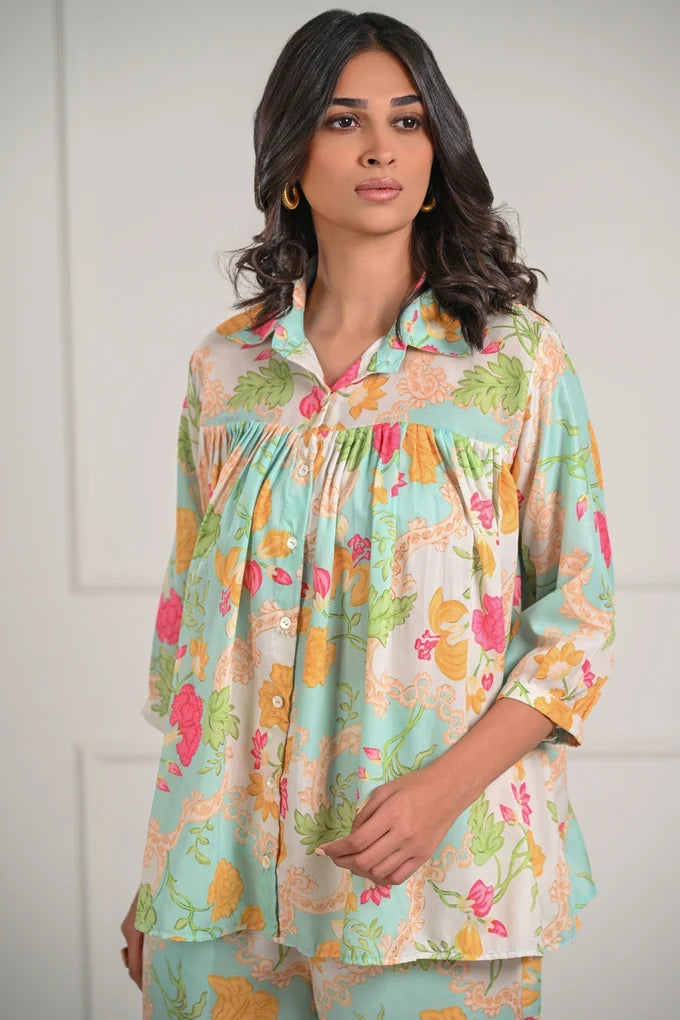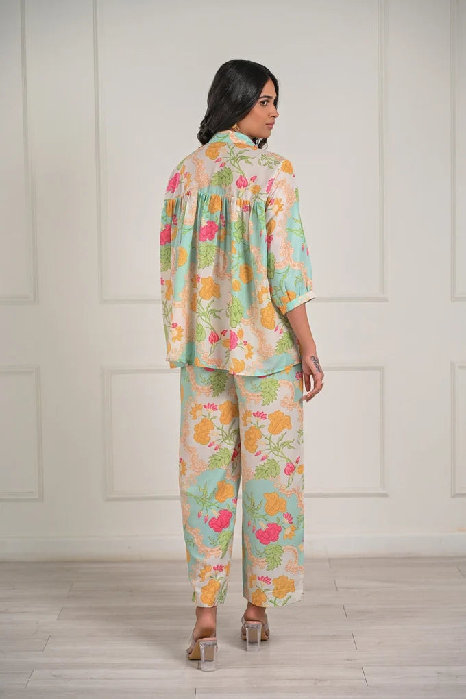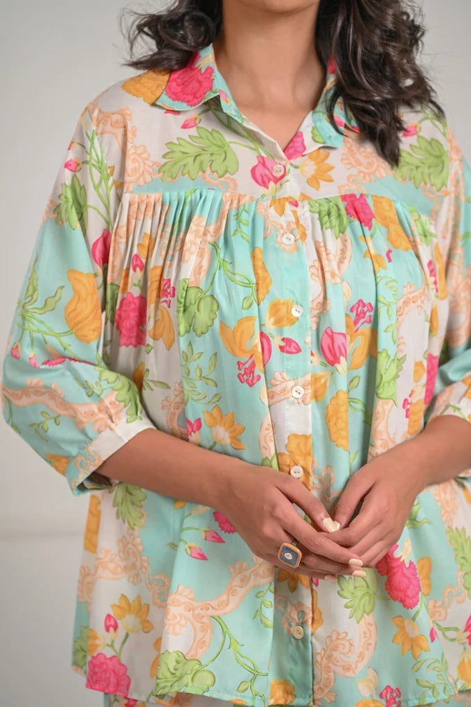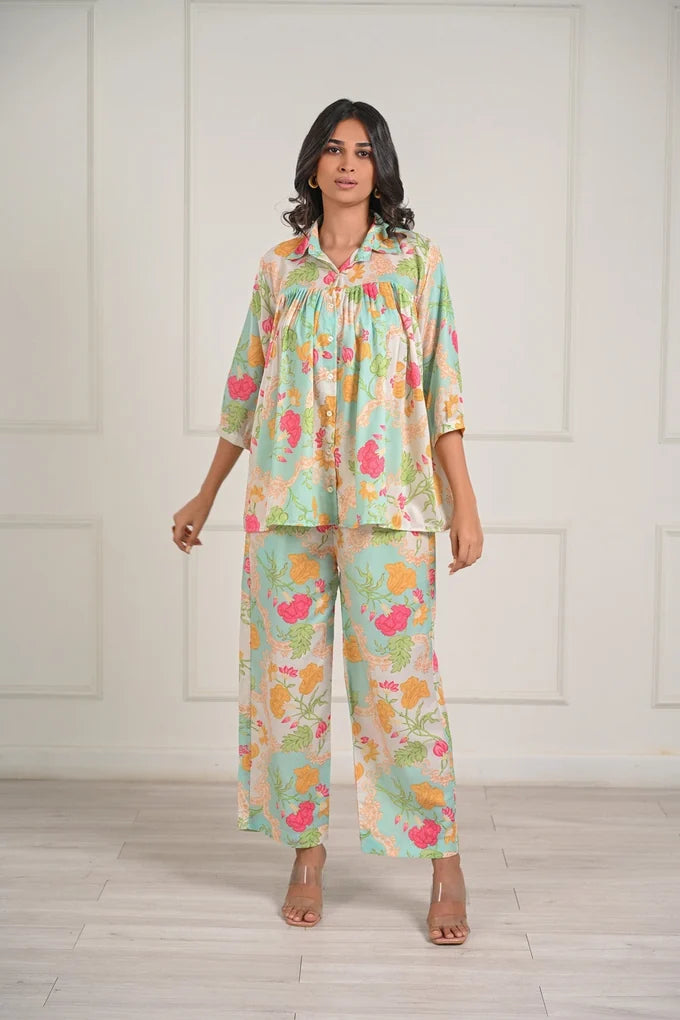 This elegant co-ord set features a flowing top with a shirt collar and button closure. The top features a ruffled detail in the front which adds a touch of femininity to the outfit. The co-ord set is crafted from soft Muslin fabric, making it comfortable and breathable to wear. The floral print is eye-catching and adds a touch of freshness to the outfit. This co-ord set is perfect for a casual day out or a lunch with friends.