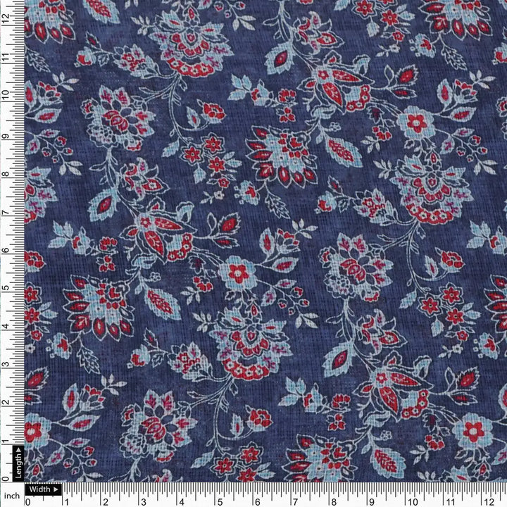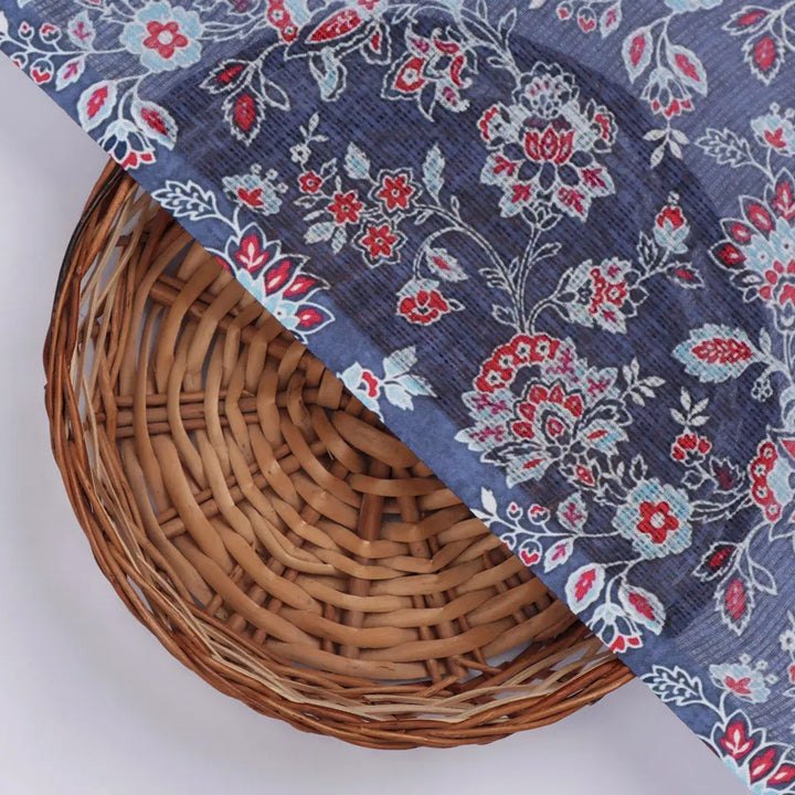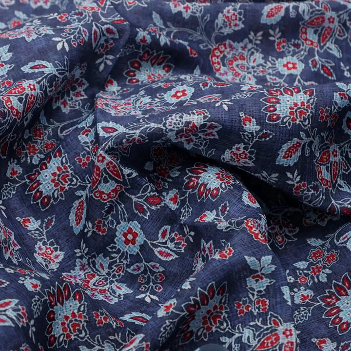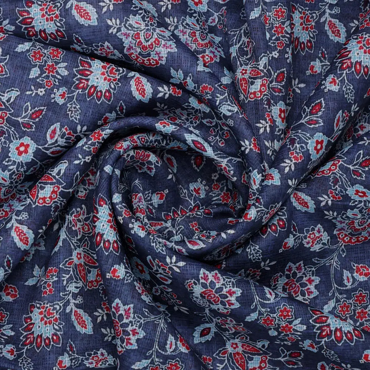 Indulge in the exquisite allure of our Floral Velly Kota Doria fabric, meticulously crafted with digital printing. This ethereal fabric boasts a captivating blend of blue and red, adorned with intricate floral motifs that evoke a sense of timeless elegance. Its soft and breathable texture, inherent to the Kota Doria weave, ensures optimal comfort and drape, making it an ideal choice for a wide range of garments and home dacor applications.
