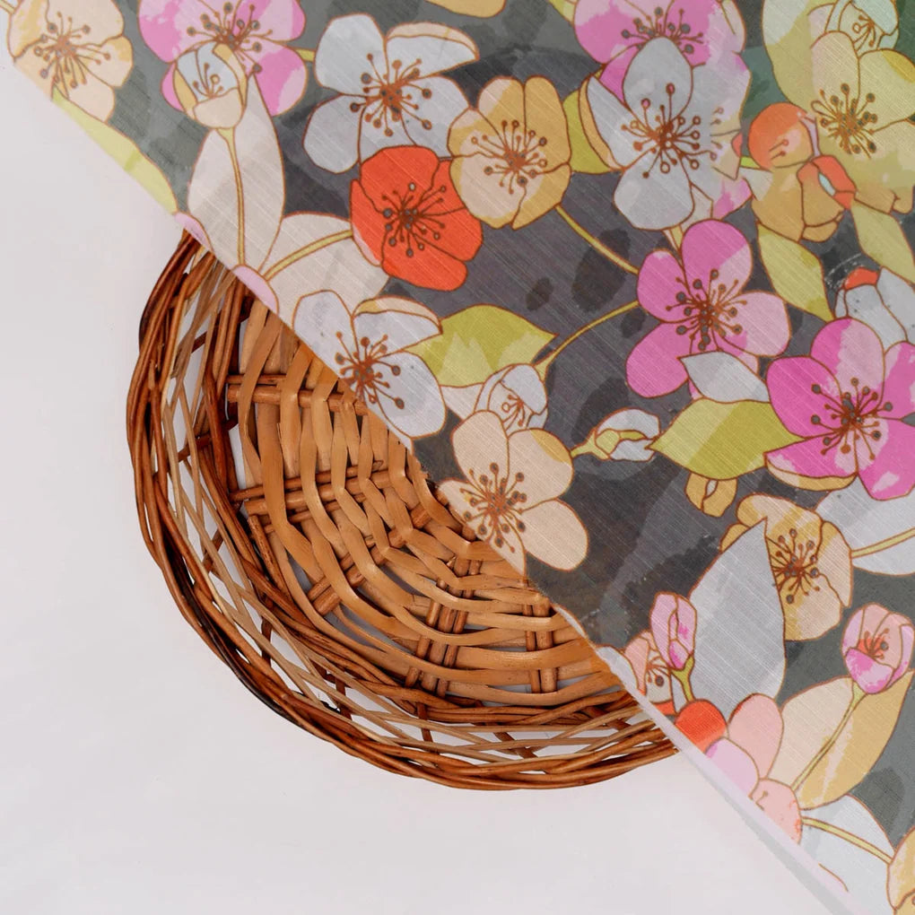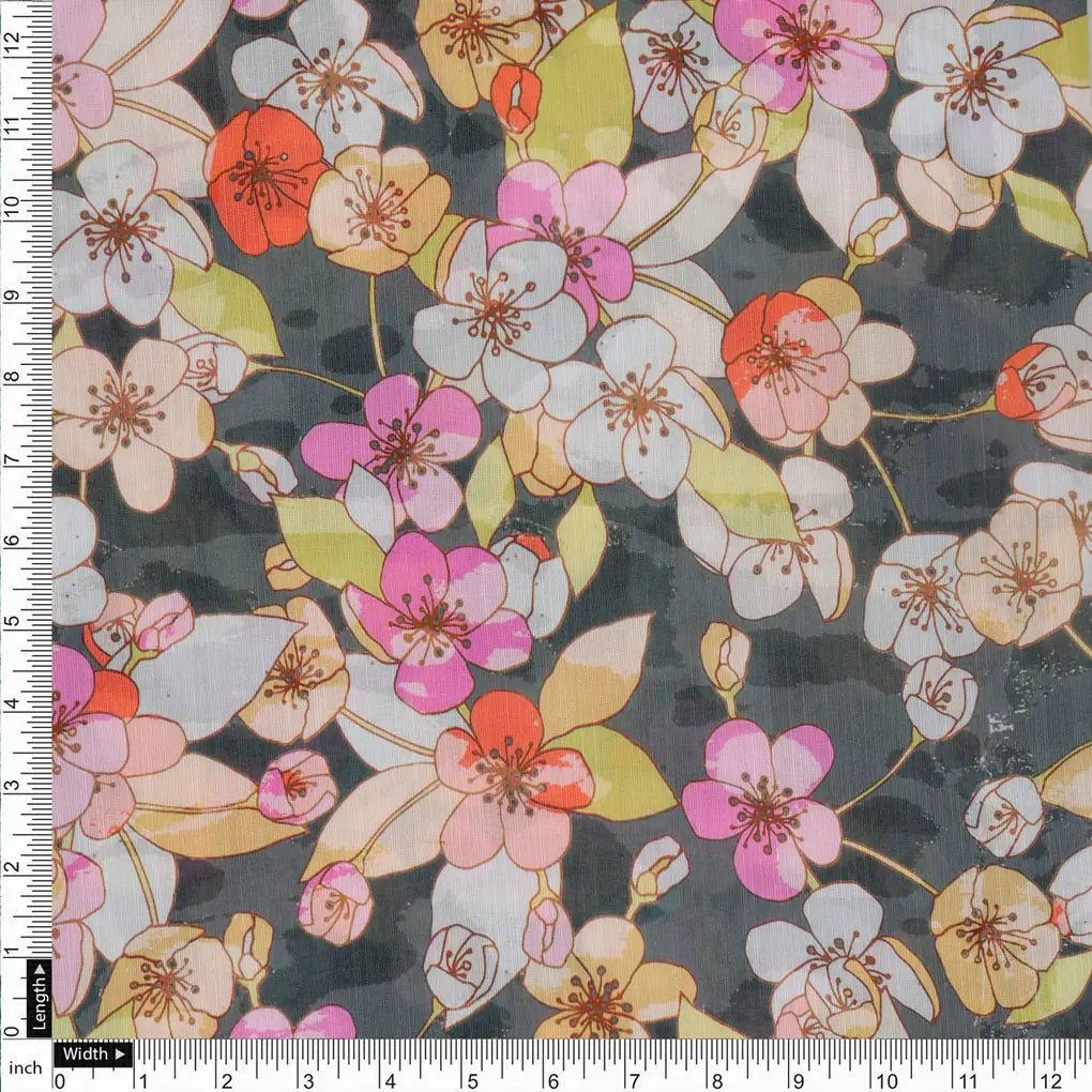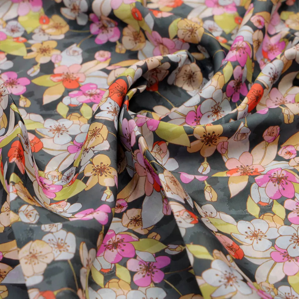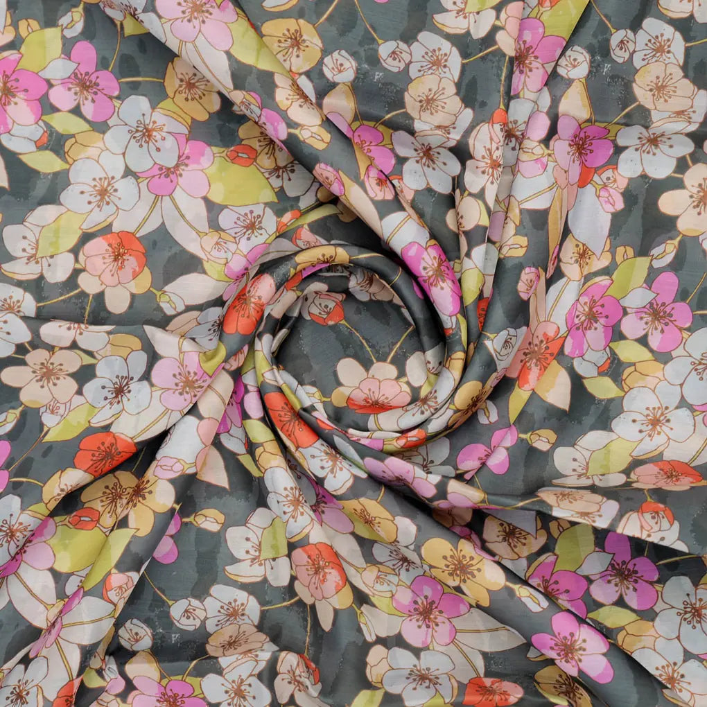 This is a beautiful linen satin fabric printed with delicate floral and leaves pattern in a black base. The fabric is soft, drapes beautifully, and is suitable for making various types of garments like tops, dresses, skirts, and blouses. It can also be used to create home decor projects like curtains, tablecloths, and cushion covers. The fabric is easy to care for and can be machine washed.
