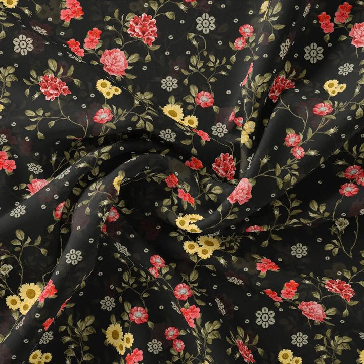 Take your style to the next level with this Beautiful Calico Flower With Branch Pure Georgette Clothing Printed Fabric from FAB VOGUE Studio. Crafted from high-quality Viscose and Pure Georgette, this fabric features a stunning floral pattern in a classic black color. Perfect for making dresses, blouses, and skirts, this fabric is a must-have for any fashionista. Add this beautiful fabric to your wardrobe and show off your unique sense of style. Shop now at FAB VOGUE Studio.