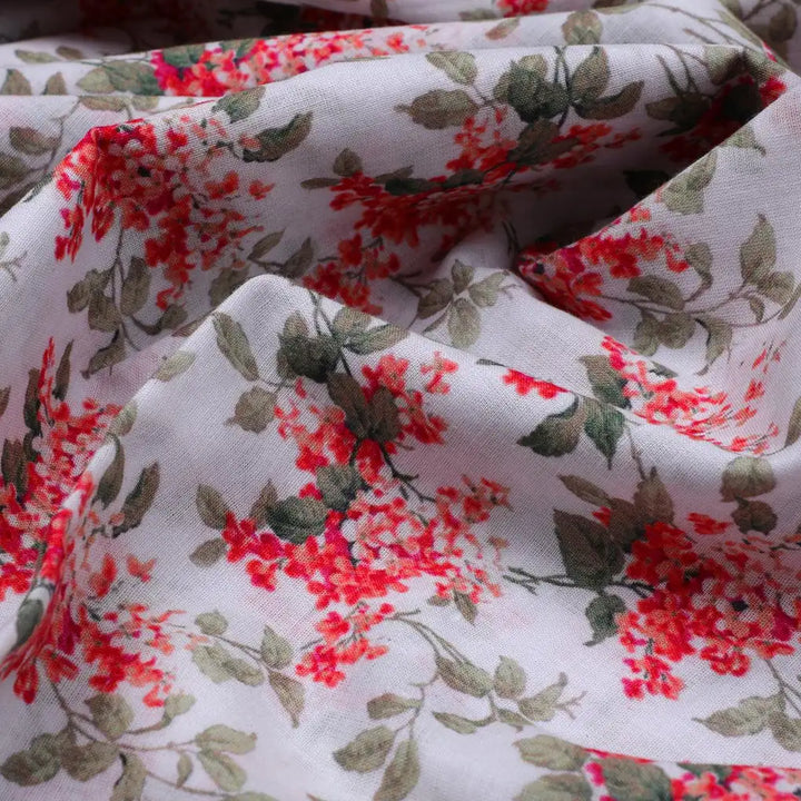 Looking for a unique fabric to give your wardrobe a stylish makeover? Look no further than FAB VOGUE Studio's Tiny Daffodil Flower With Birch Leaves Pure Cotton Kurtis Printed Fabric. Crafted from pure cotton, this fabric is lightweight and breathable, making it perfect for creating stylish and comfortable kurtis. The fabric features a beautiful floral pattern with tiny daffodil flowers and birch leaves in shades of white, adding a touch of elegance to any outfit.