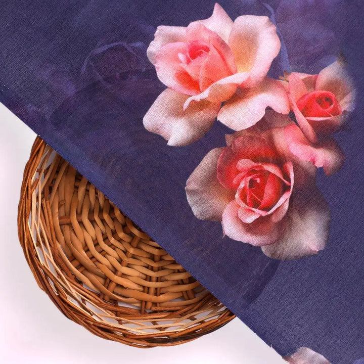 Valvet Blue Background With Creamy Roses Digital Printed Fabric - Pure Cotton