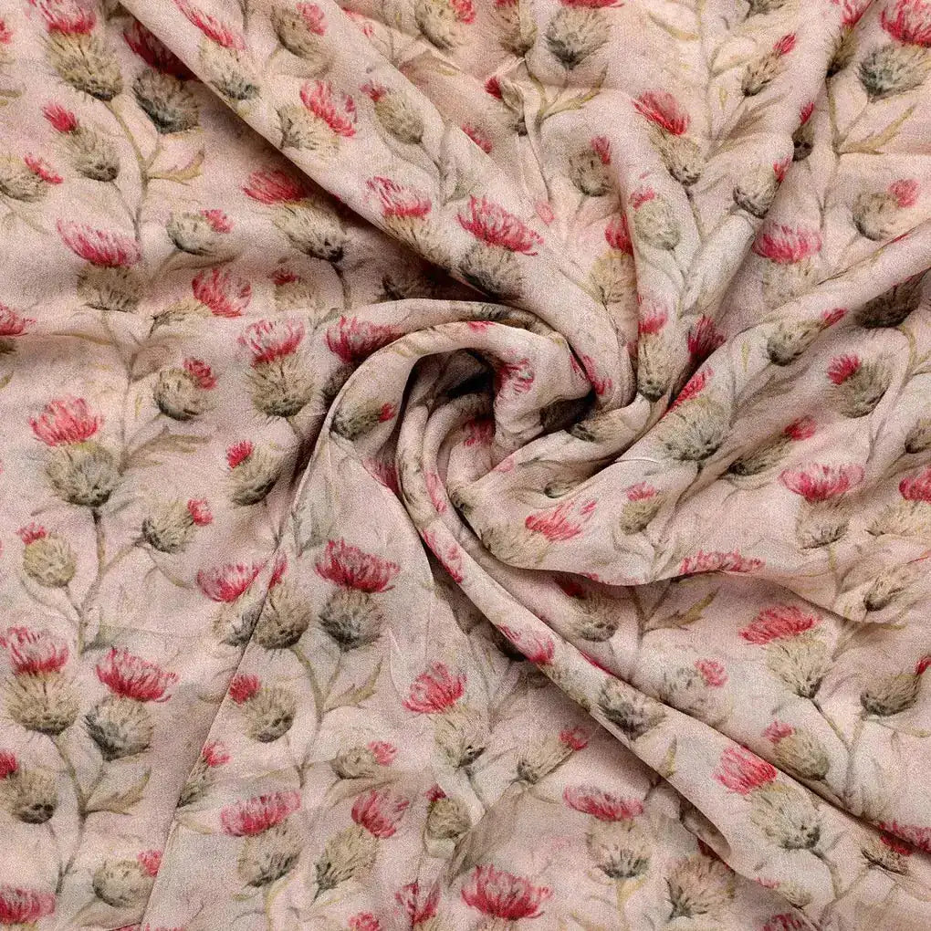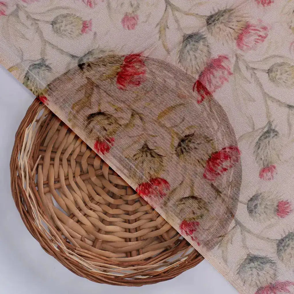 Are you looking for a unique fabric to make a timeless statement? Look no further than this beautiful floral vines over cream base pure georgette digital printed fabric from FAB VOGUE Studio. This fabric is made of high-quality viscose that is lightweight and durable. The fabric is adorned with an intricate floral pattern in a stunning wine color. Its delicate texture and vibrant colors make it perfect for creating stylish outfits for any occasion. With its versatile design, this fabric can be used for making garments, home décor items, and more. Create beautiful and timeless pieces with this gorgeous fabric from FAB VOGUE Studio.