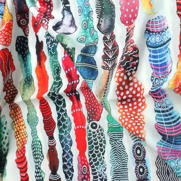 Introducing the Colourful Round Stripes Kora Silk Kurtis Printed Fabric from FAB VOGUE Studio. This beautiful fabric is made from high-quality polyester and features a unique Kora Silk fabric. The fabric has a white base with a strip pattern that adds a touch of elegance to any outfit. The fabric is perfect for making kurtis and other garments that will make you stand out from the crowd. With its soft texture and vibrant colors, this fabric is sure to make a statement. Add a touch of elegance to your wardrobe with this exquisite fabric from FAB VOGUE Studio.