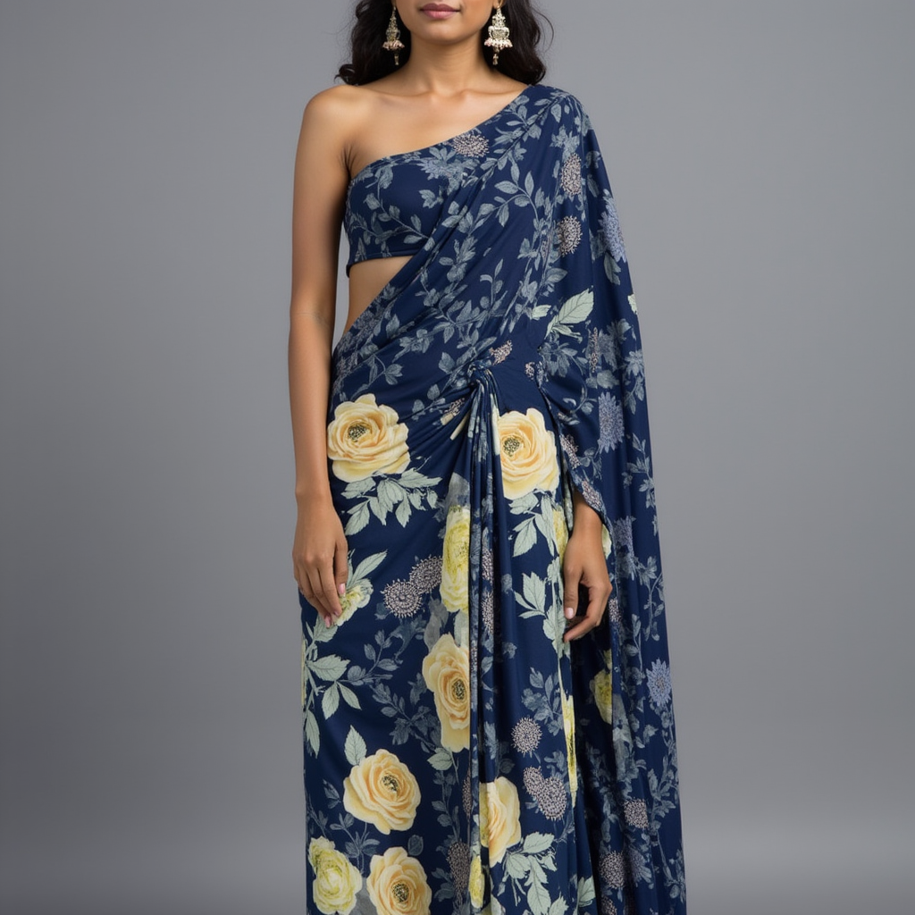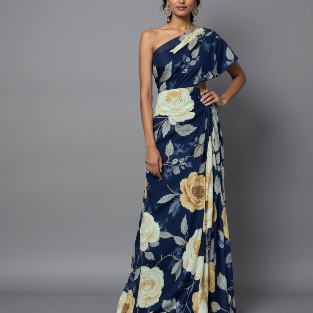 Elegant Floral Over Blue Base Digital Printed Fabric