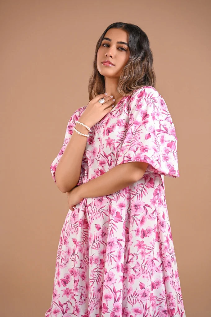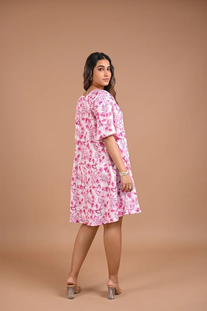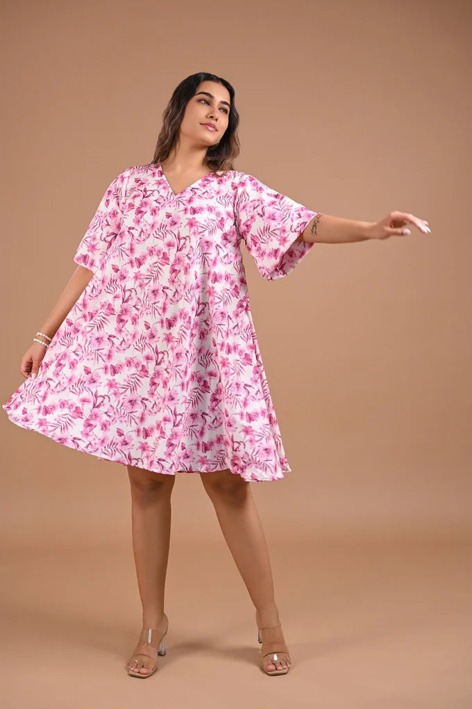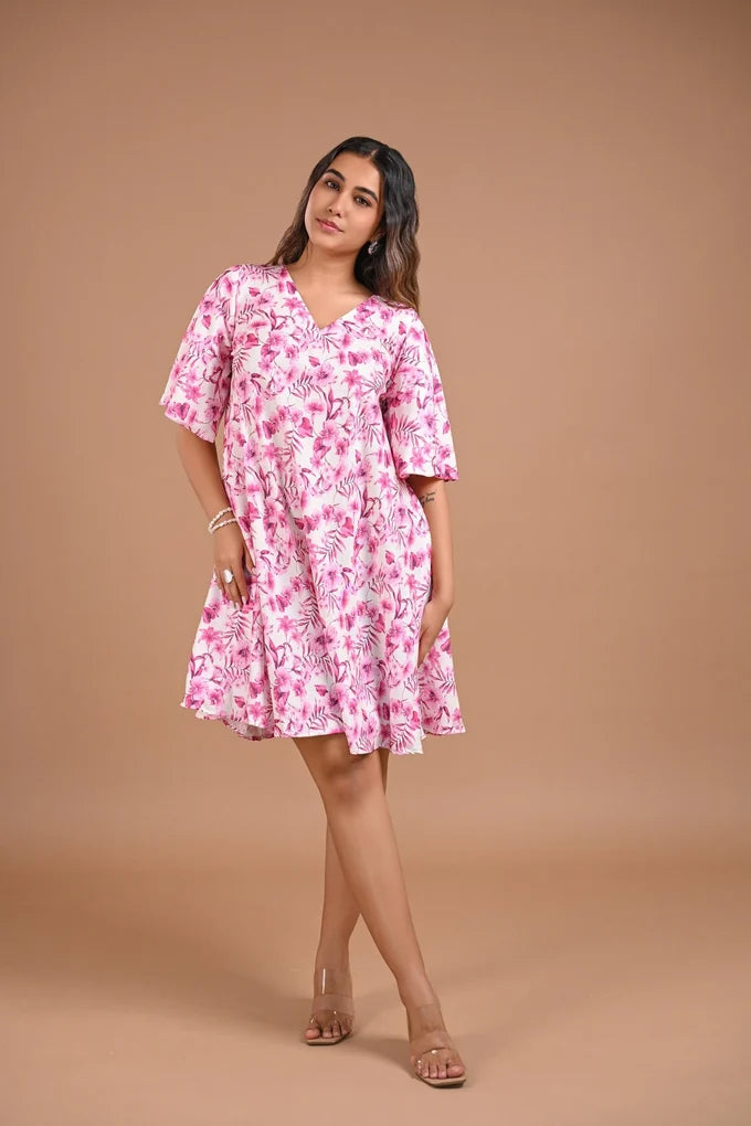 This aaRVee Studio Floral Printed A-Line Short Dress is perfect for a casual summer day. It features a flattering A-line silhouette, a V-neckline, and short sleeves. The dress is made from a lightweight and comfortable rayon fabric that is perfect for warm weather. The floral print is both stylish and feminine, making this dress a versatile choice for any occasion. This mini dress features a flared hemline and is perfect for any casual occasion.