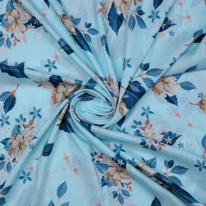 Flower On Ocean Blue Digital Printed Fabric - Muslin