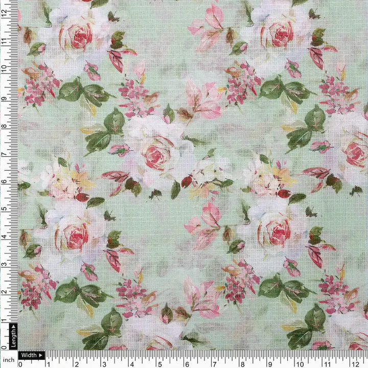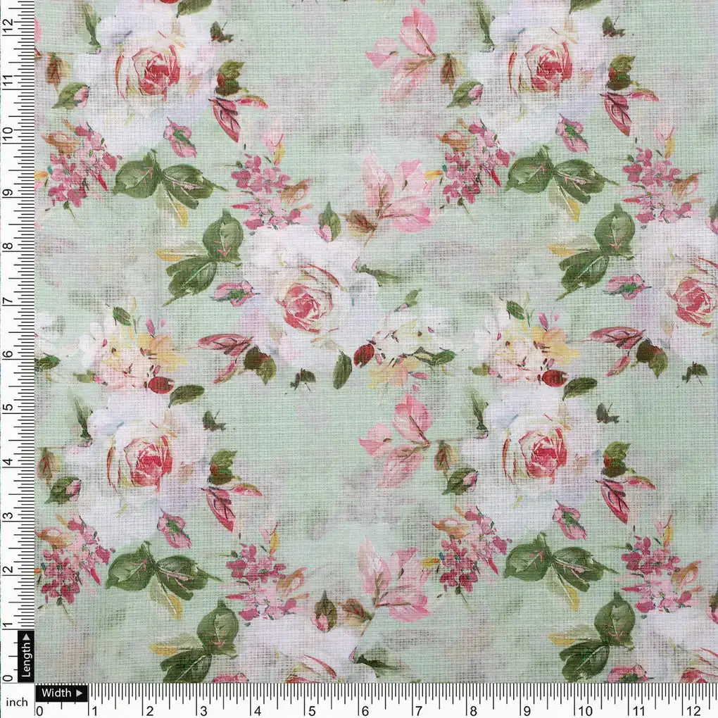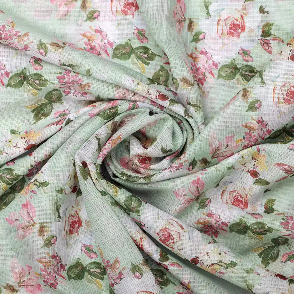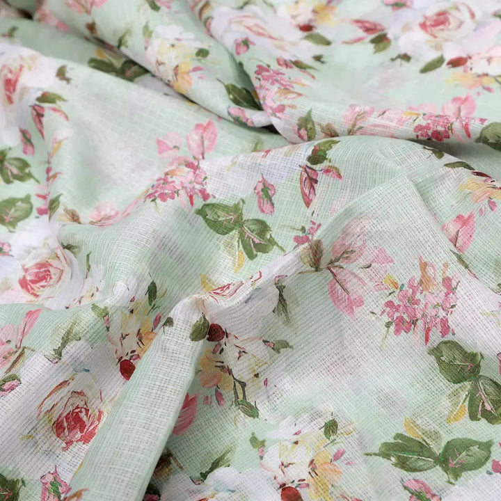 Indulge in the beauty of FAB VOGUE Studio's Bunch Of Flower Floral Kota Doria fabric, an exquisite digital printed creation showcasing vibrant floral and leaf motifs in a symphony of green, white, and pink. Its intricate design and ethereal texture, crafted from the finest Kota Doria fabric, will elevate any sewing project with its timeless charm.