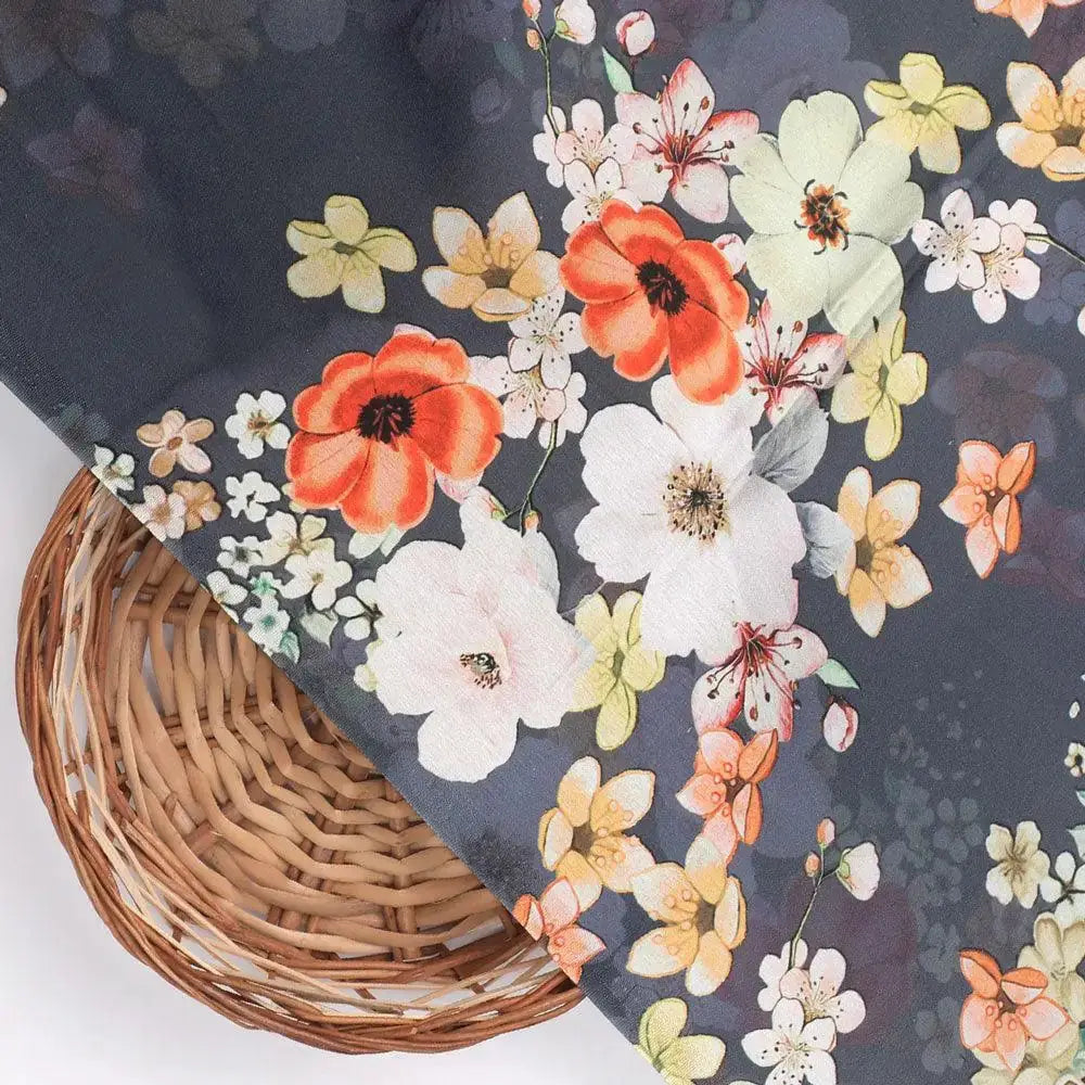 Multicolour Orchid Flower With Grey Background Digital Printed Fabric - Japan Satin