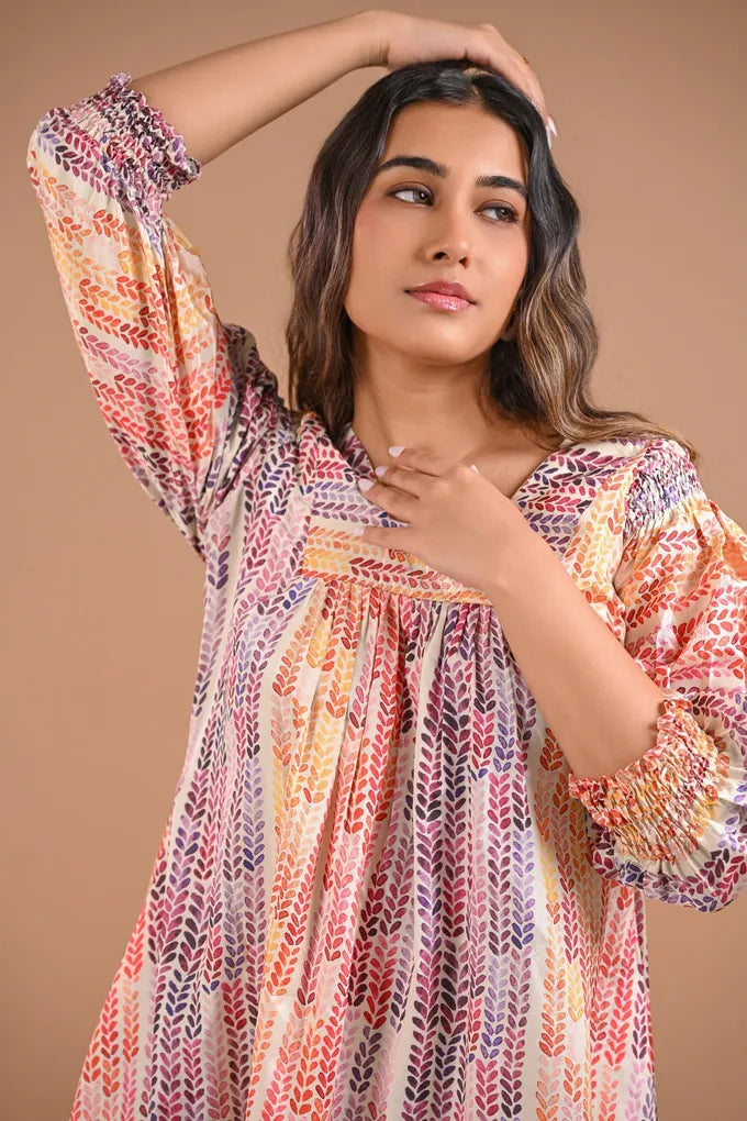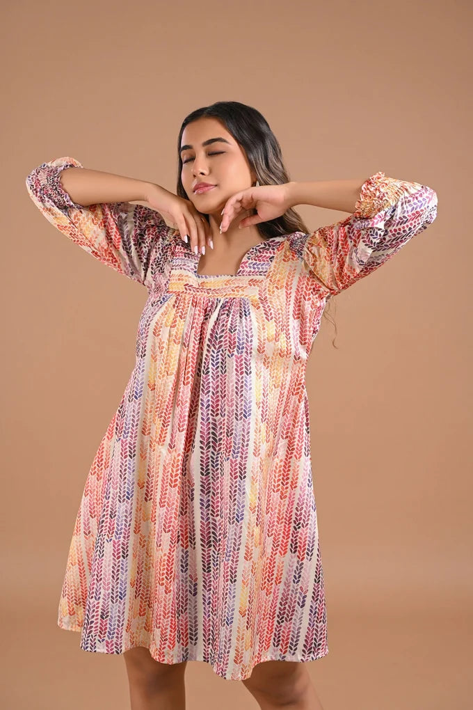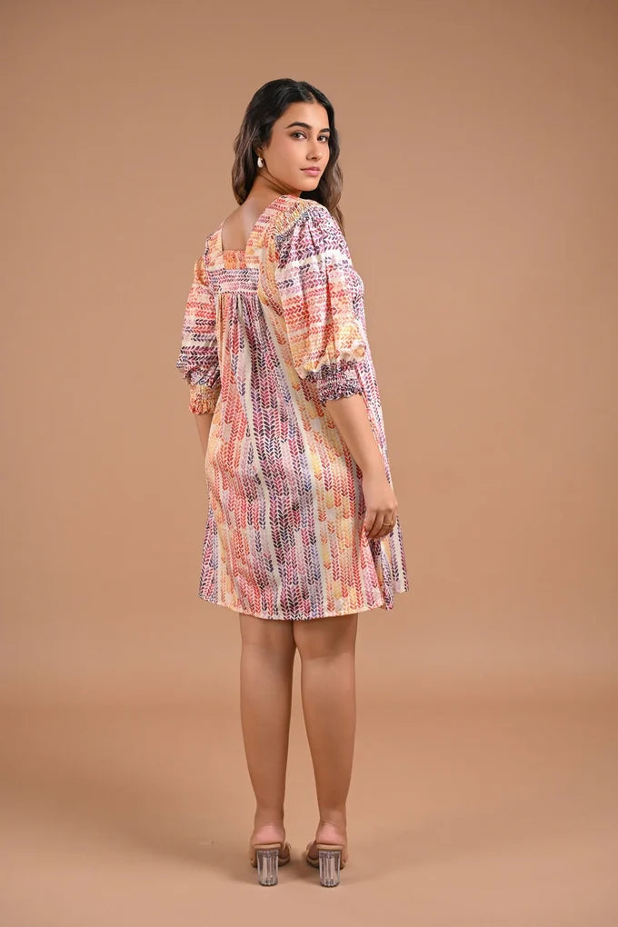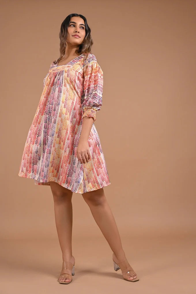 This charming mini dress is a perfect blend of style and comfort. Crafted from soft and breathable fabric, it features a beautiful geometric print in vibrant shades of white, orange, and purple. The square neck adds a touch of elegance, while the gathered detail at the bodice creates a flattering silhouette. The three-quarter sleeves with puff detail and the loose fit ensure all-day comfort, making it ideal for casual outings, picnics, or running errands.