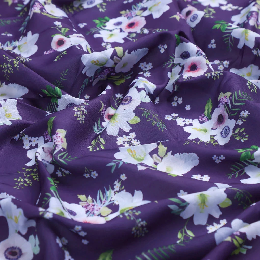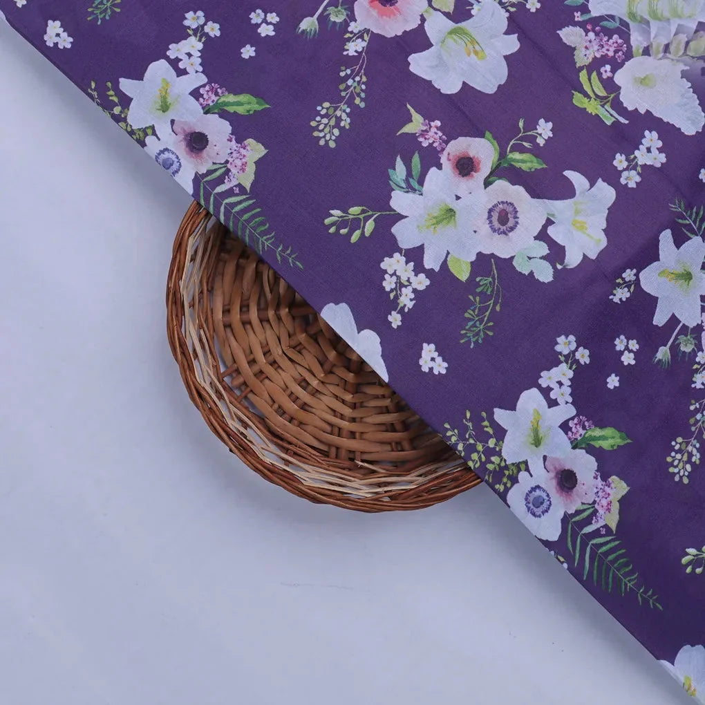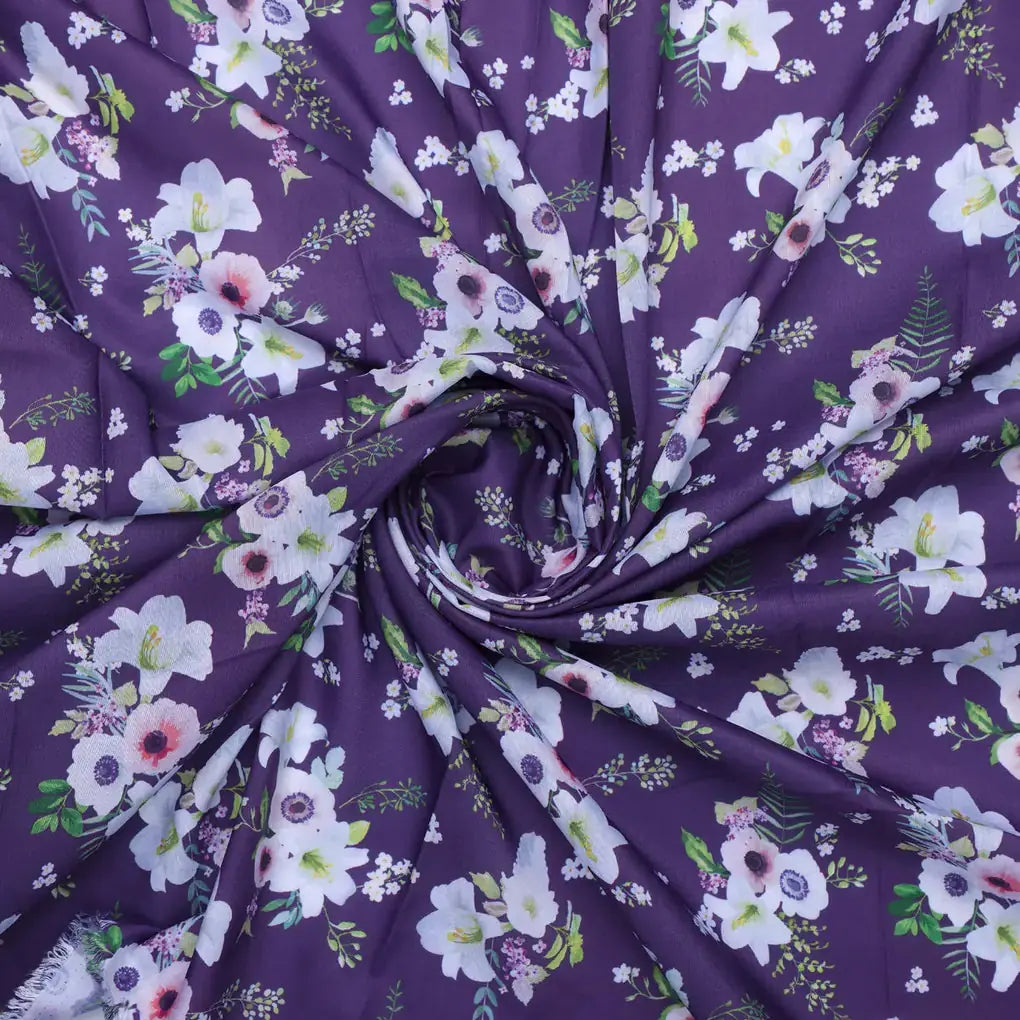 This purple floral muslin fabric is perfect for creating a variety of projects, from dresses and skirts to curtains and home decor. The fabric is lightweight and airy, making it ideal for summer wear. It is also wrinkle resistant and easy to care for.