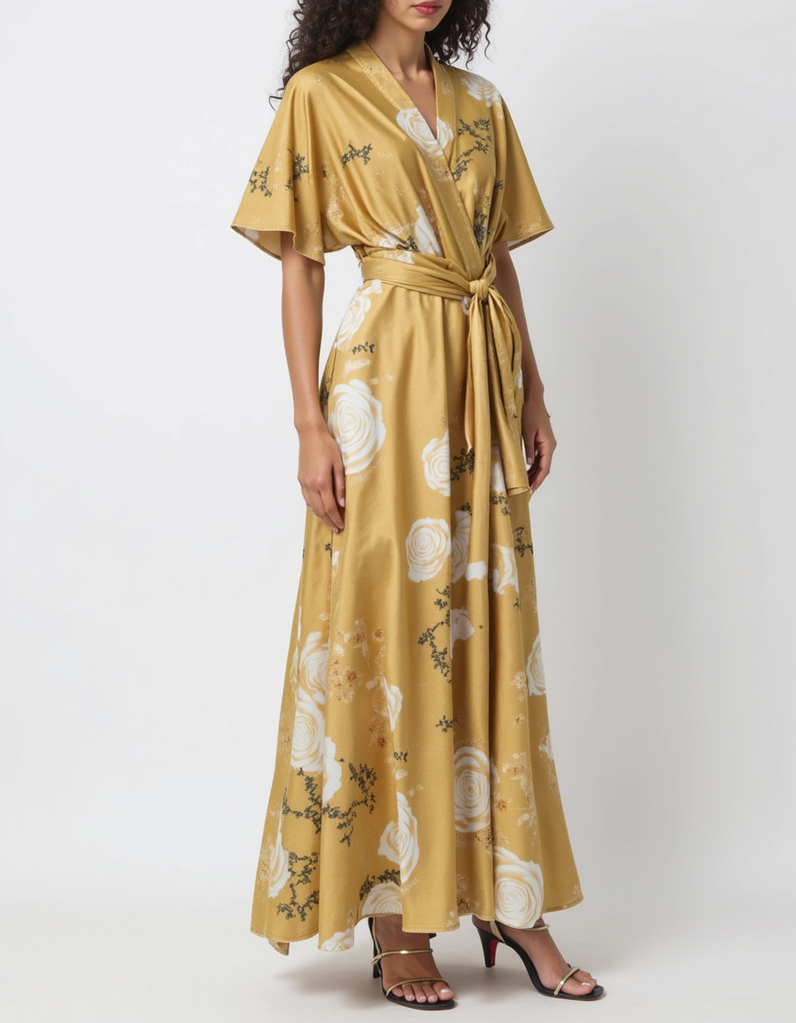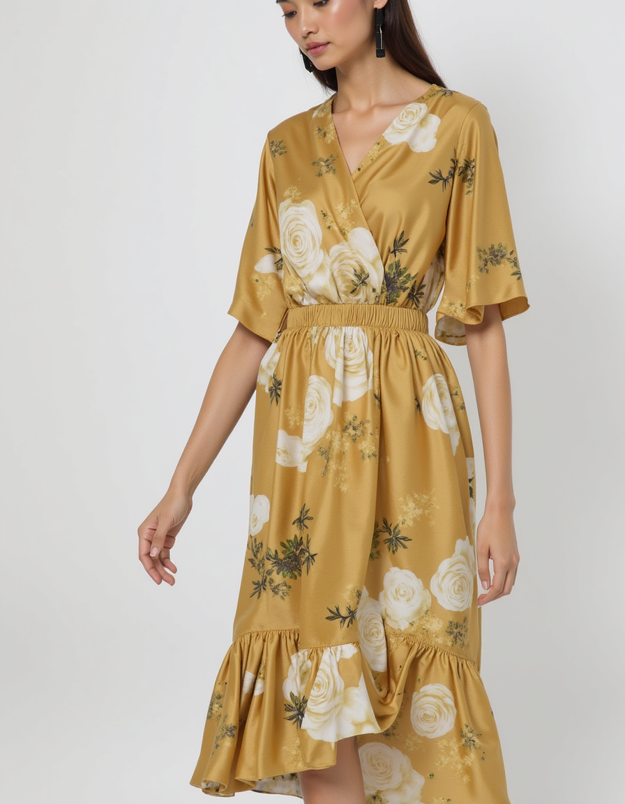 Classy Yellow Floral Digital Printed Japan Satin Fabric