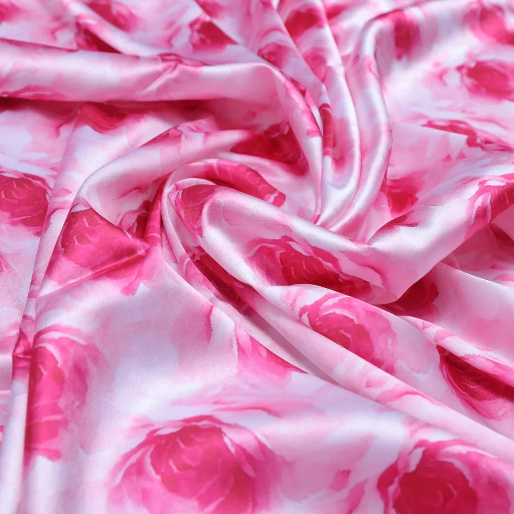 This pink roses printed japan satin fabric is perfect for creating beautiful and elegant dresses, skirts, blouses, and other garments. It is also great for home decor projects such as curtains, pillows, and tablecloths.