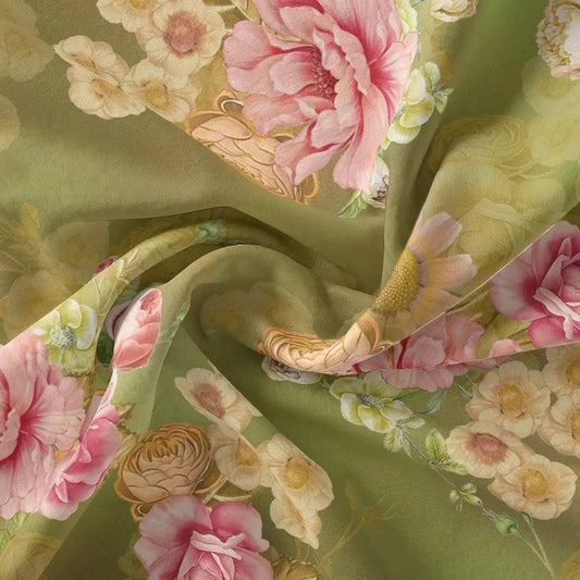 Floral Bright Golden Floral Digital Printed Fabric - Kora Silk