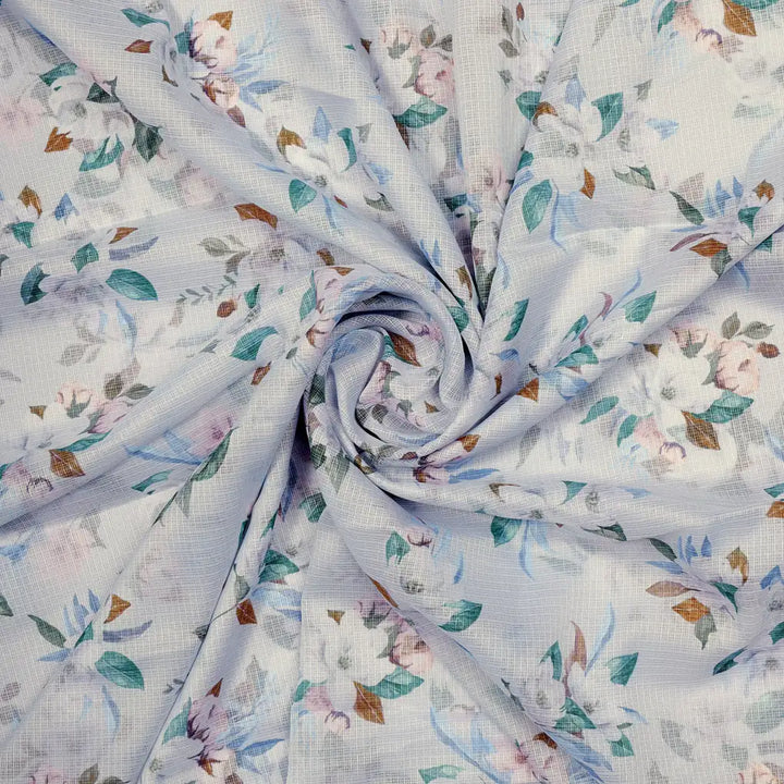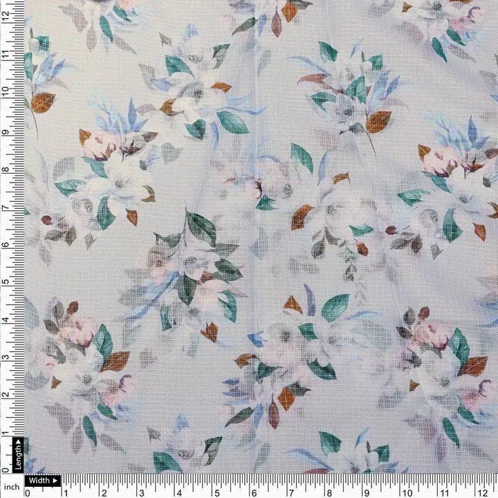 Indulge in the ethereal beauty of our Kota Doria Digital Printed Fabric, adorned with a captivating floral and leaf design in vibrant hues of white, green, and peach. Perfect for discerning fashionistas and home decore enthusiasts, this exquisite fabric from FAB VOGUE Studio will elevate your creations with its exceptional quality and timeless appeal.