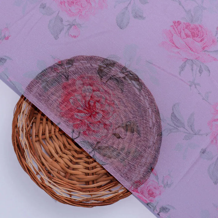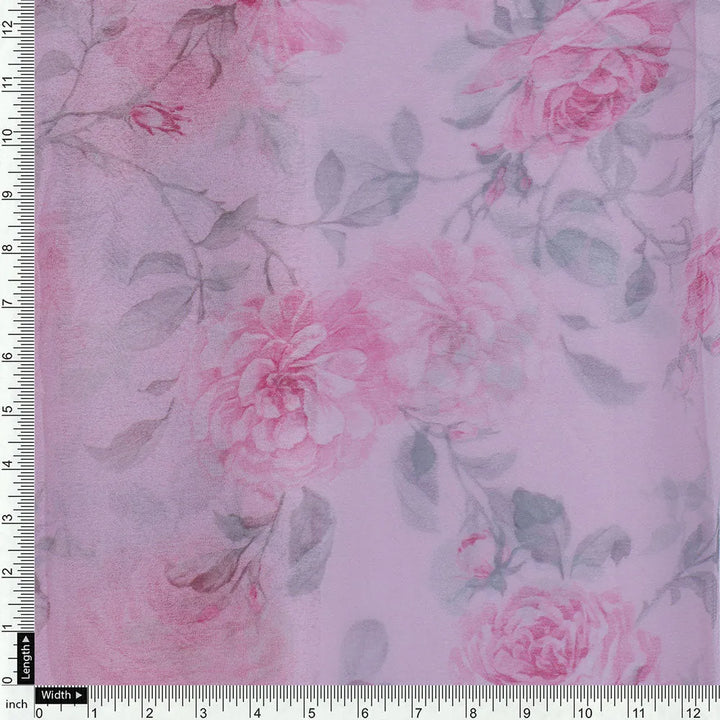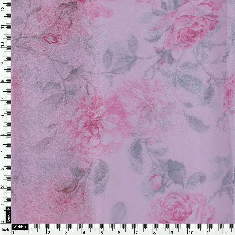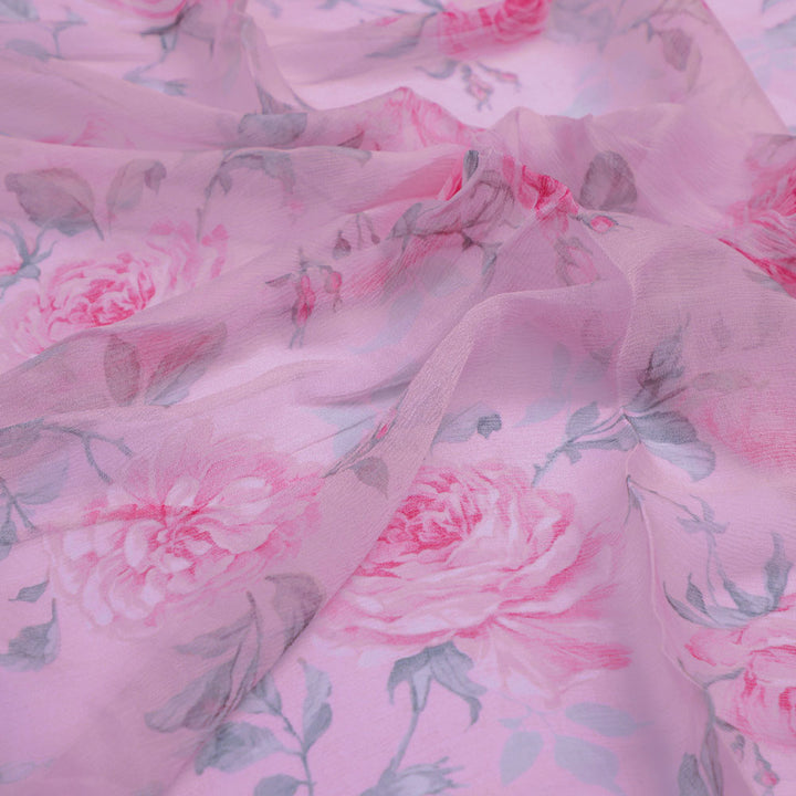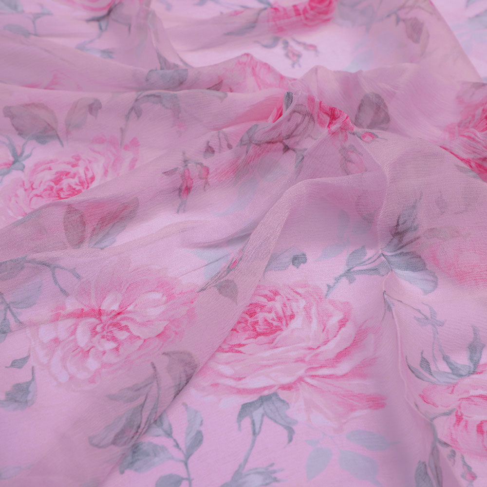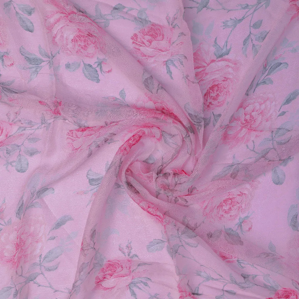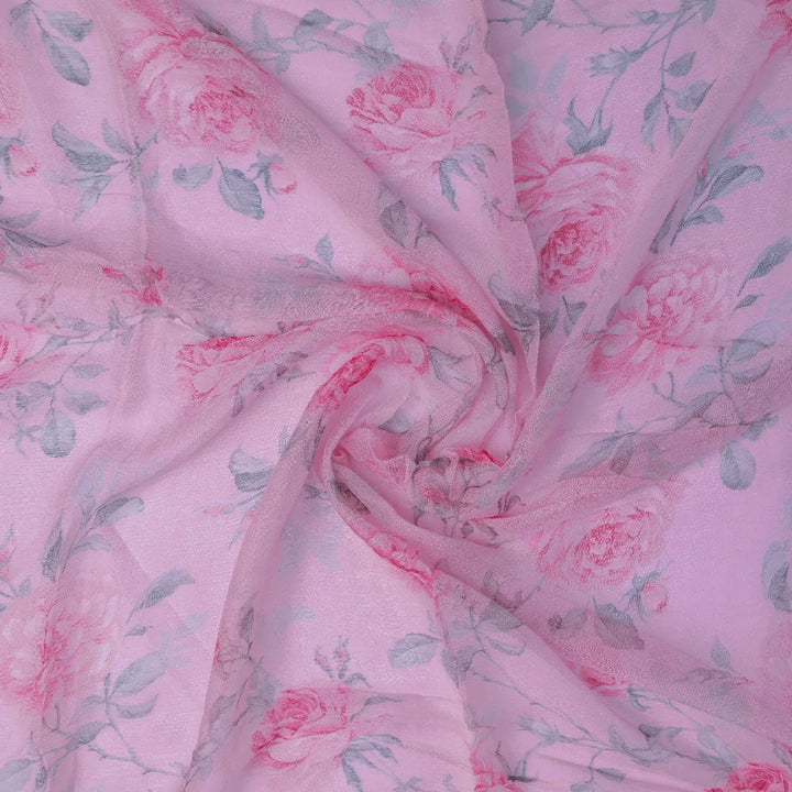 FAB VOGUE Studio presents a beautiful floral and leaves digital printed chiffon fabric in pink color. This fabric is perfect for making stylish tops, dresses, skirts, and more. It is also great for home decor projects. Order yours today!