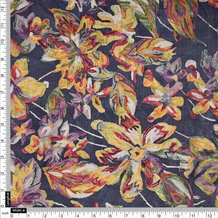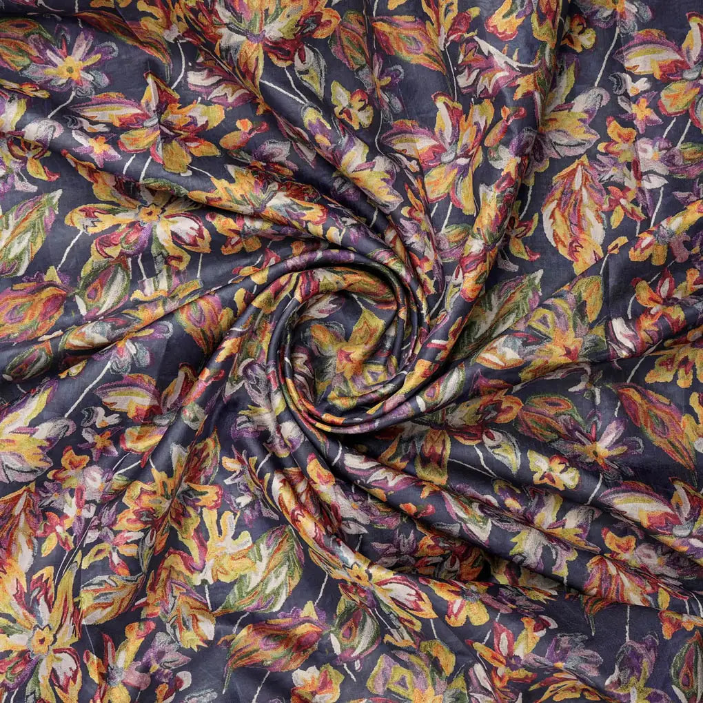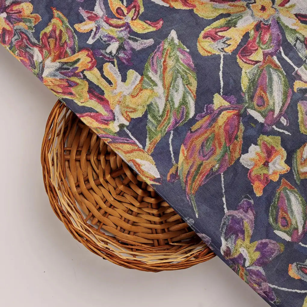 This exquisite Dola Silk fabric features a vibrant floral print, adding a touch of elegance to any garment or project. The fabric is crafted with a blend of polyester fibers, making it soft, durable, and easy to care for. Its medium weight provides a luxurious feel, while the intricate floral pattern adds a touch of sophistication. The Navy Blue base is beautifully complemented by vibrant Yellow, Orange, and Purple tones in the floral design, creating a visually stunning contrast. This versatile fabric is perfect for stitching a variety of outfits, including dresses, tops, and sarees. It can also be used for home decor purposes, adding a touch of class to your living space.