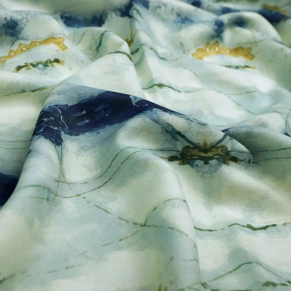₹ 339.00 per meterGorgeous Linen Fabric Awash in Blue and Cream with Enchanting Floral and Leaves Print