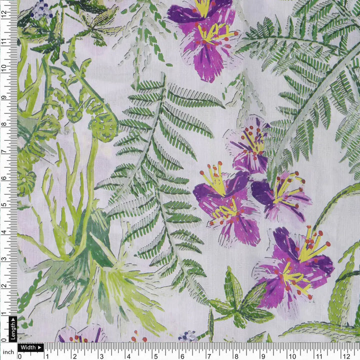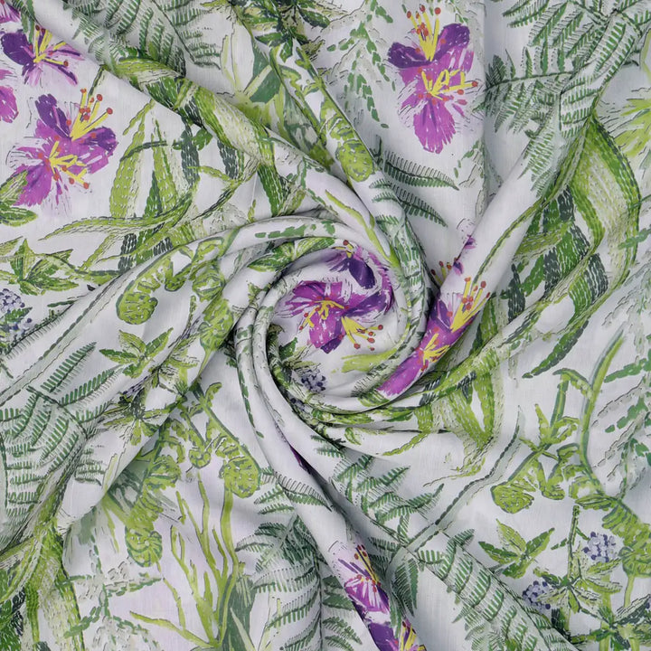 This beautiful linen fabric features a delicate floral and leaves print in shades of green and purple on a white background. The fabric has a soft, smooth hand feel and a subtle sheen. The fabric is medium weight and drapes beautifully, making it ideal for creating a variety of garments and home decor items.