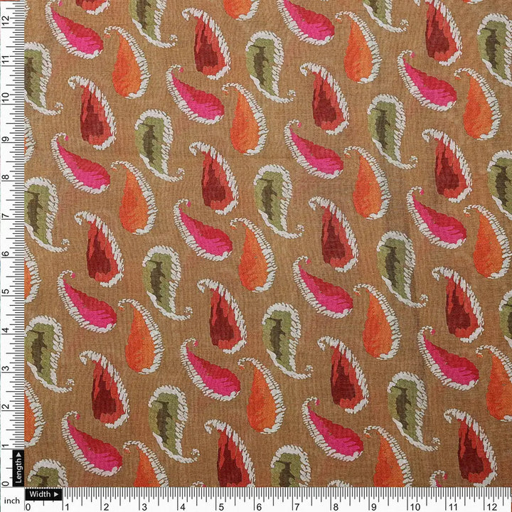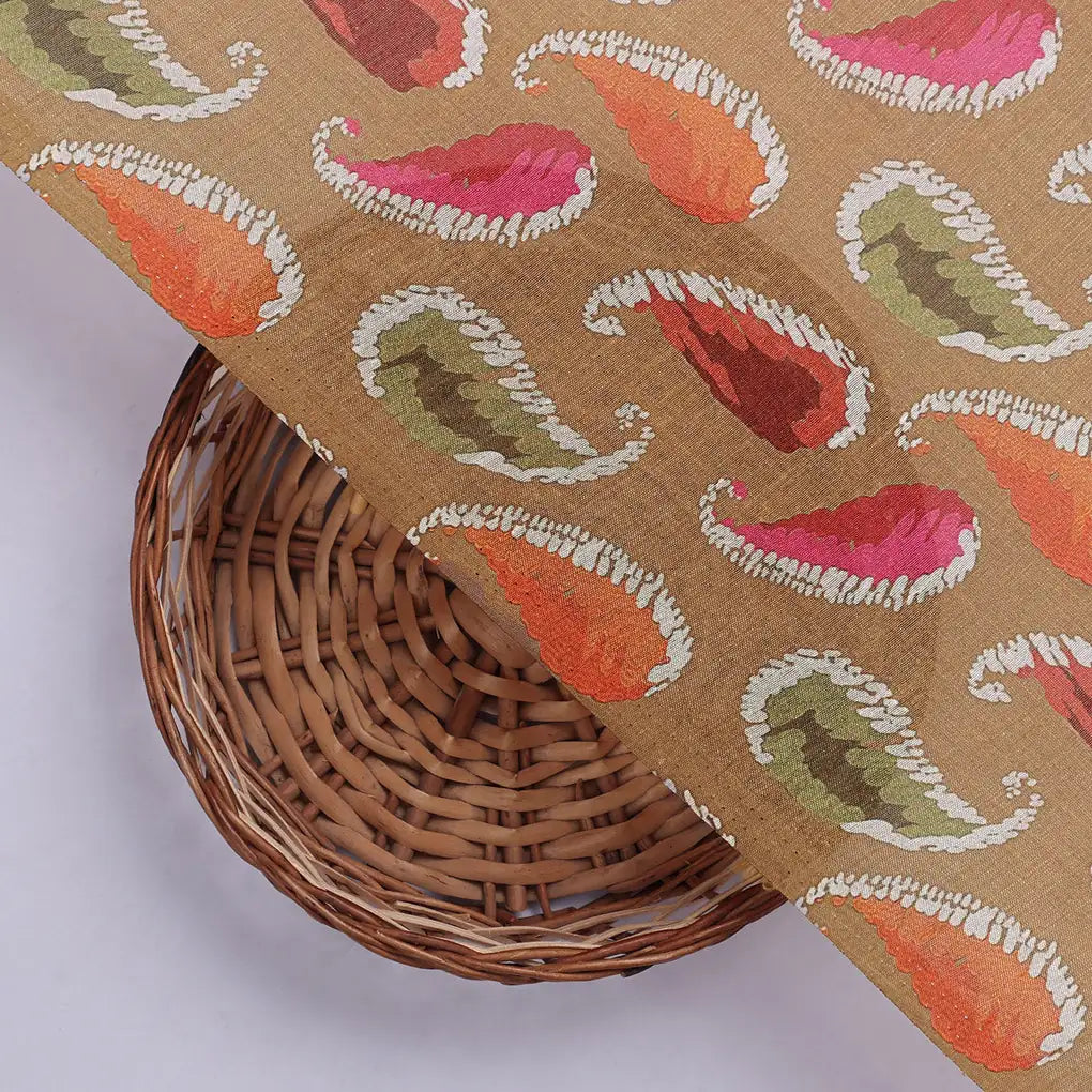 Experience the allure of our Colourfull Paisley Print Tusser Silk fabric, a captivating digital print that showcases intricate paisley motifs in a vibrant palette of brown, green, orange, and red. This luxurious fabric from FAB VOGUE Studio is perfect for creating statement pieces that exude elegance and style.