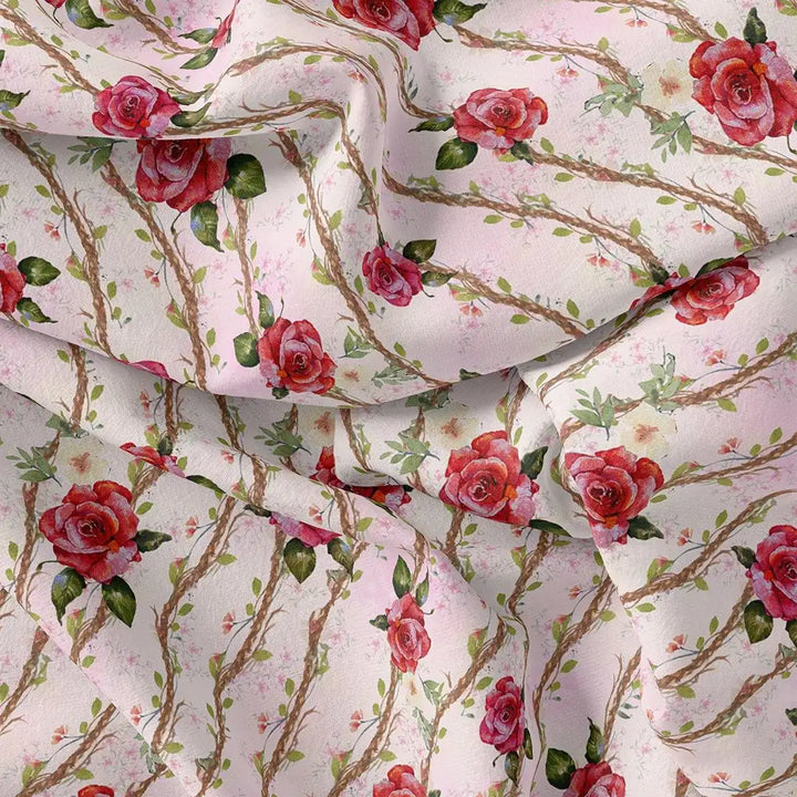 Autumnal Red Roses With Leaves Digital Printed Fabric