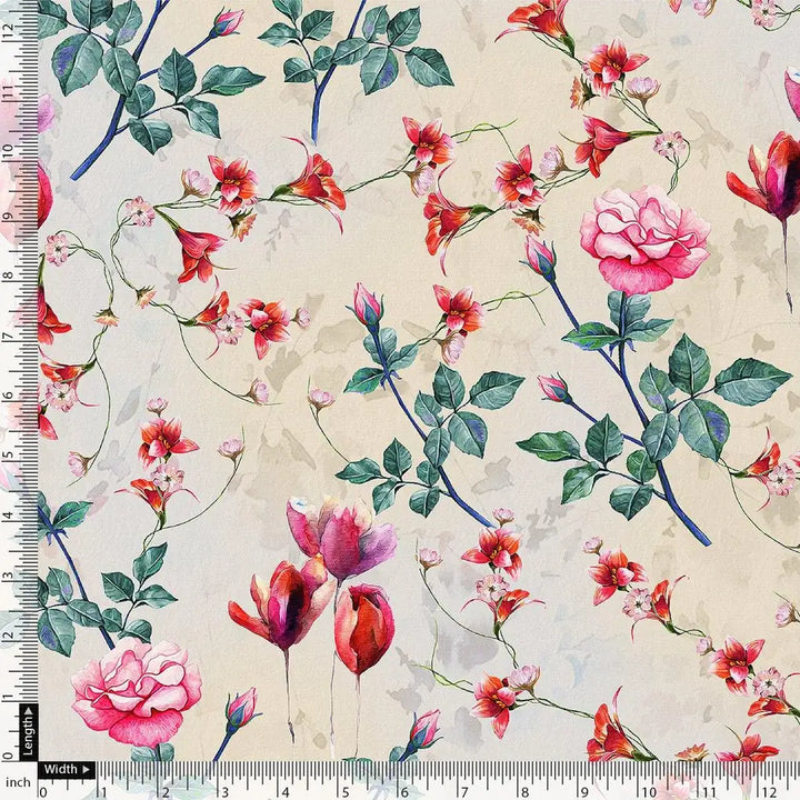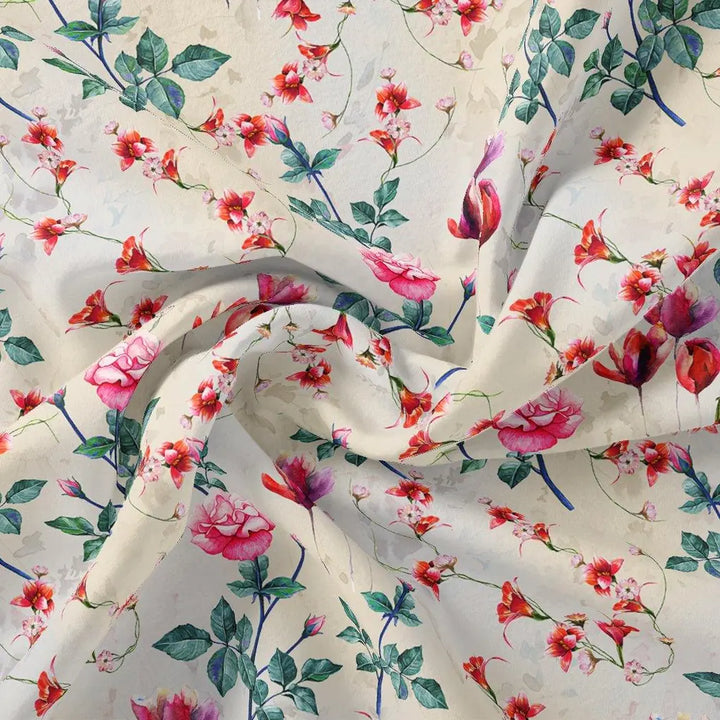 This beautiful ditsy red rose with lavender rose upada silk fabric from FAB VOGUE Studio is perfect for any special occasion. Crafted from the finest quality Viscose, this fabric is soft, lightweight, and breathable. The cream color with a floral pattern adds a touch of elegance and sophistication to your look. Whether you're looking for a fabric to make a dress, blouse, or any other garment, this fabric is the perfect choice. With its stunning design and luxurious feel, you'll be sure to make a statement.