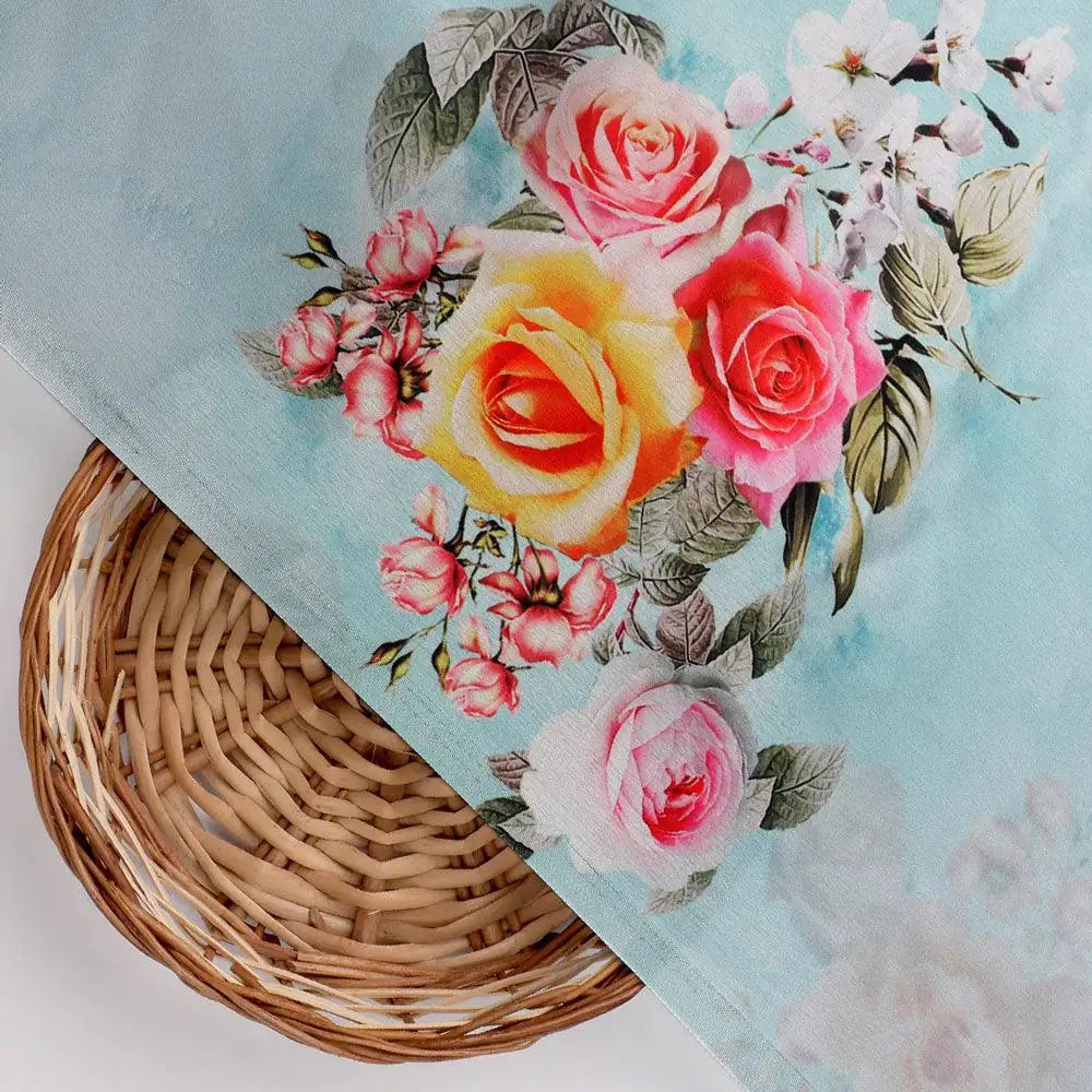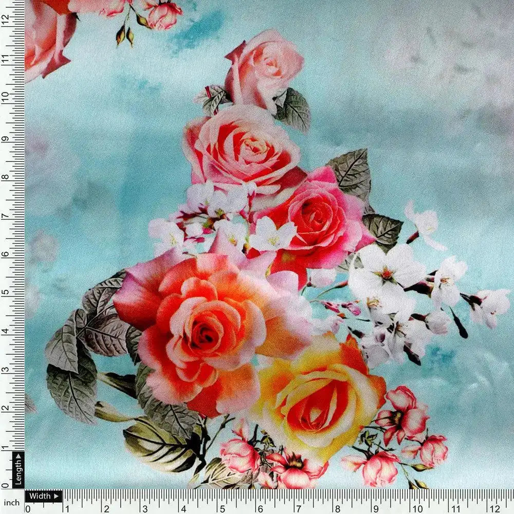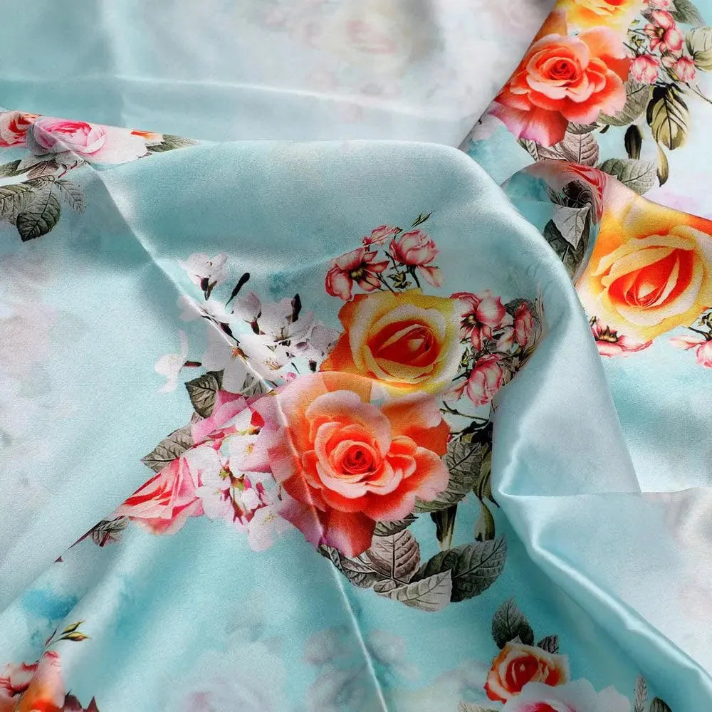 Bring home the beautiful White Orchid Flower Japan Satin Digital Printed Fabric from FAB VOGUE Studio. This high-quality polyester fabric is perfect for creating stylish and fashionable clothing. The fabric features a stunning floral pattern in sky color that will add a unique touch to your wardrobe. It is lightweight yet durable, making it a great choice for any kind of clothing.
