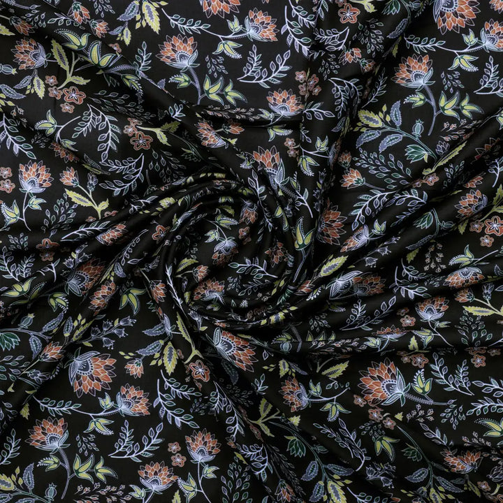 This black muslin fabric is printed with a beautiful floral pattern. The flowers are in shades of orange, yellow, green, and white. The fabric is perfect for making dresses, skirts, tops, and other garments.