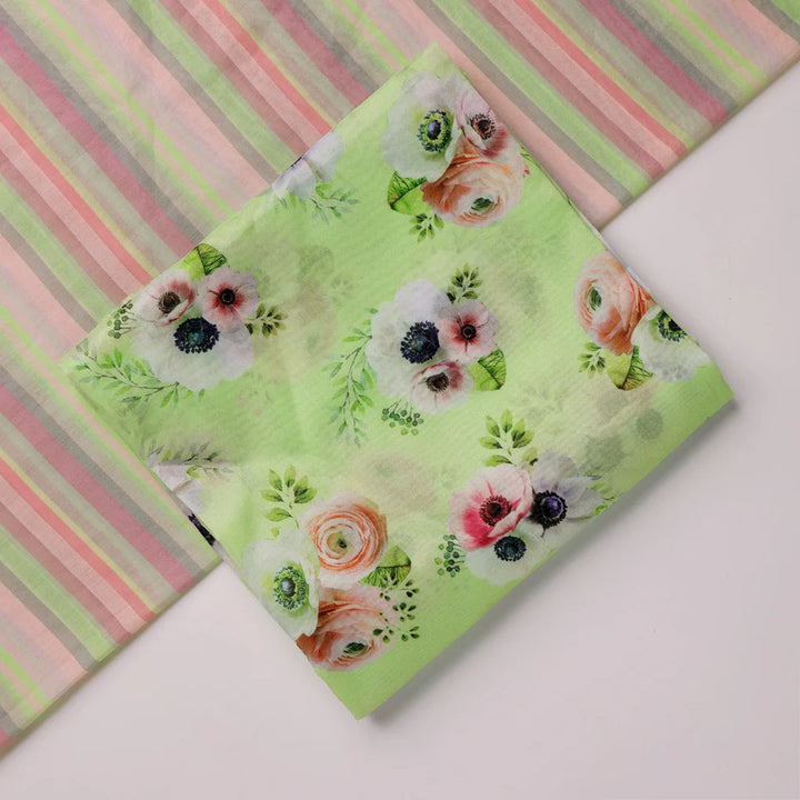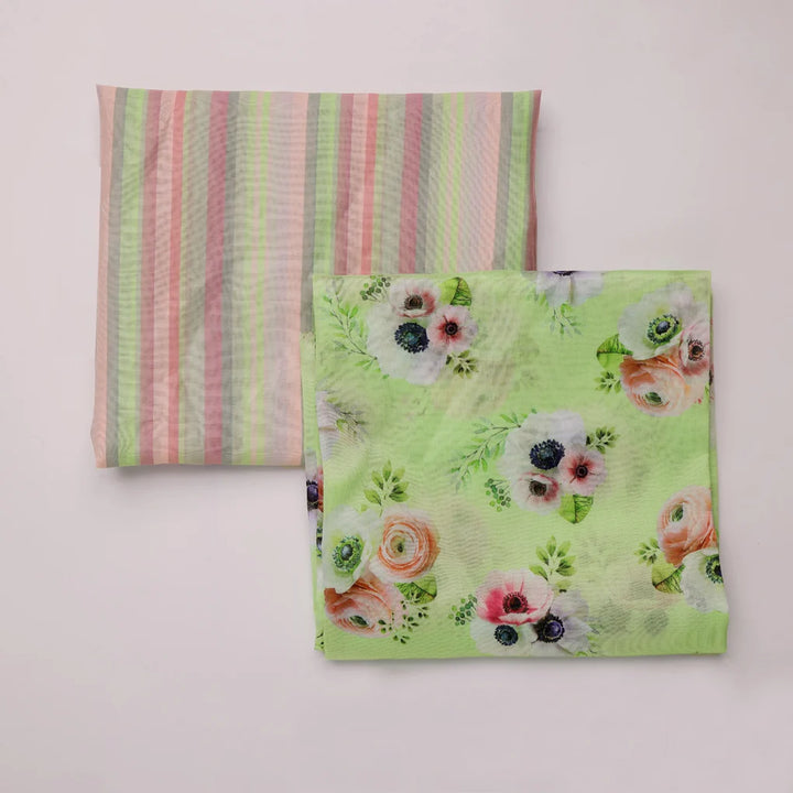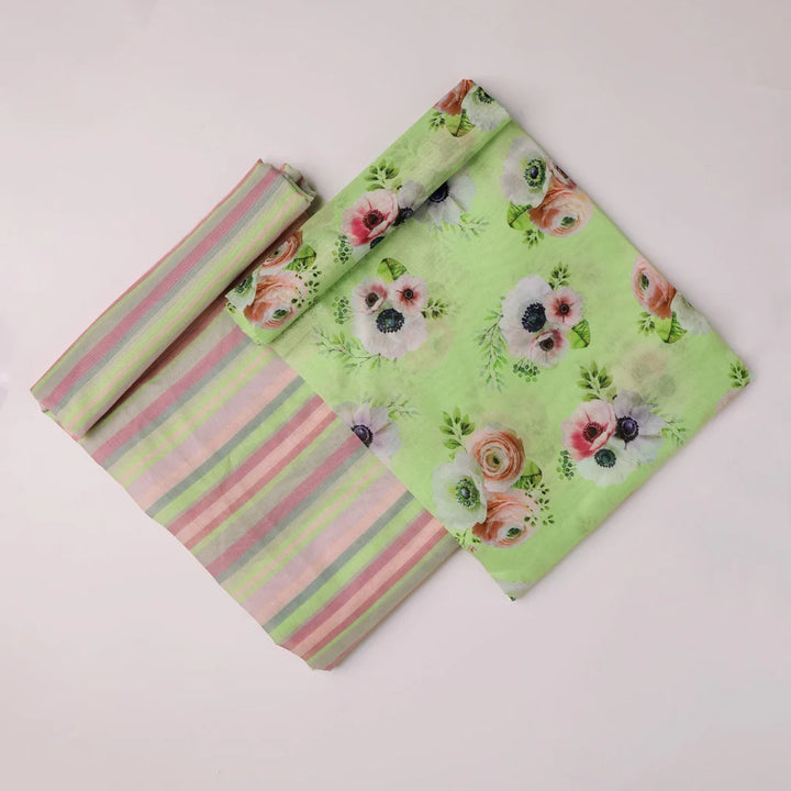This Chanderi printed fabric set is perfect for creating a variety of garments. The set includes two pieces of fabric, each measuring 2.5 meters in length. The fabric is a lightweight and breathable cotton blend, making it ideal for summer wear. The print is a beautiful floral design in shades of green, pink, and white. This fabric set is perfect for making dresses, skirts, tops, and pants. It can also be used for home decor projects, such as curtains, pillows, and tablecloths.