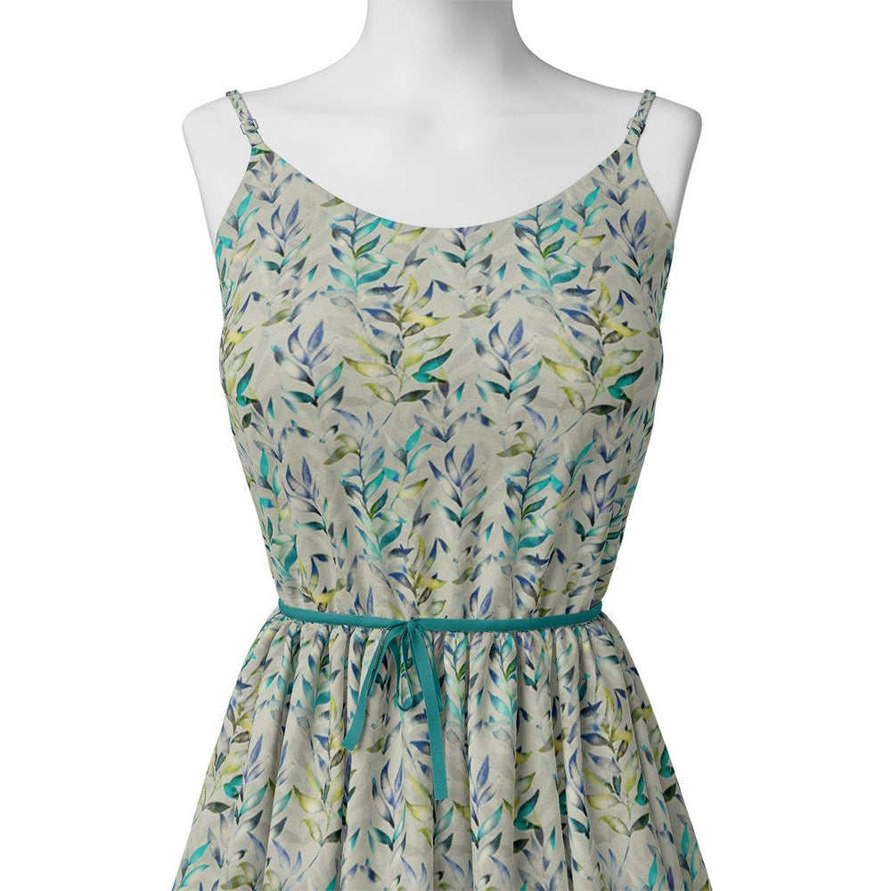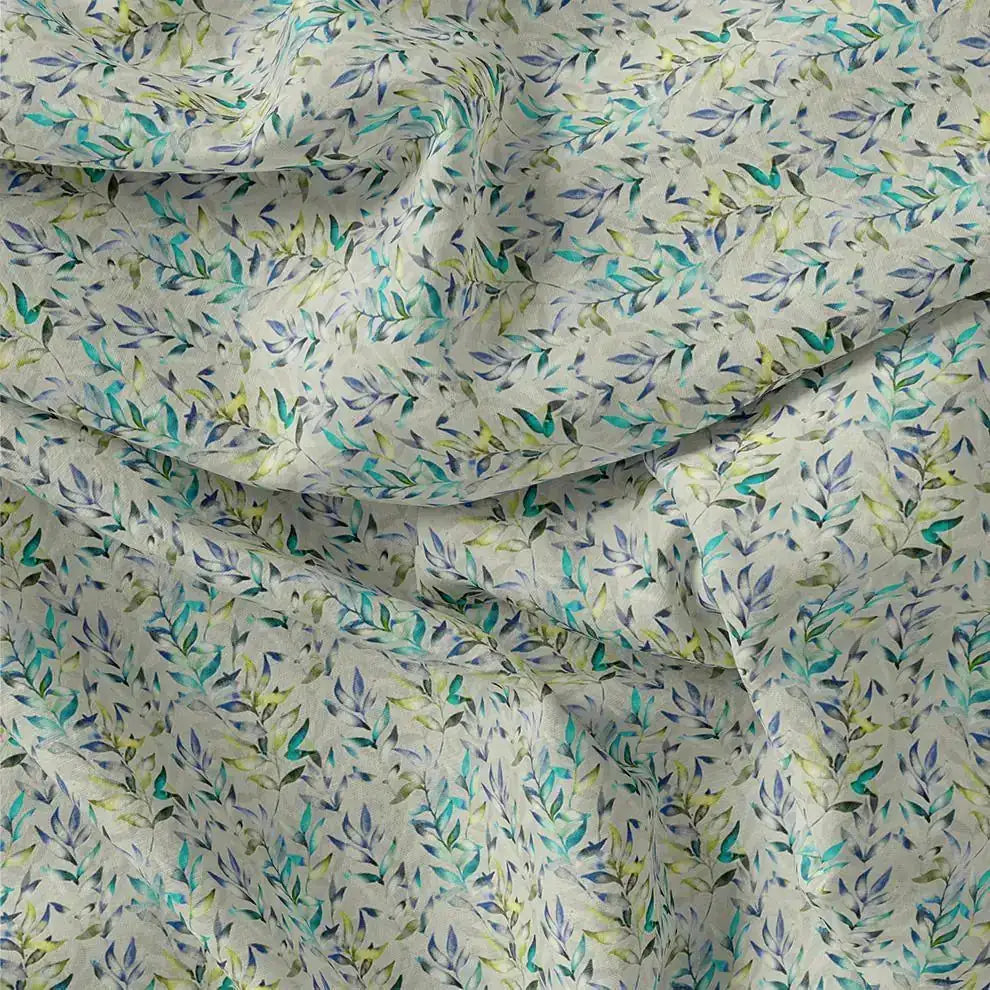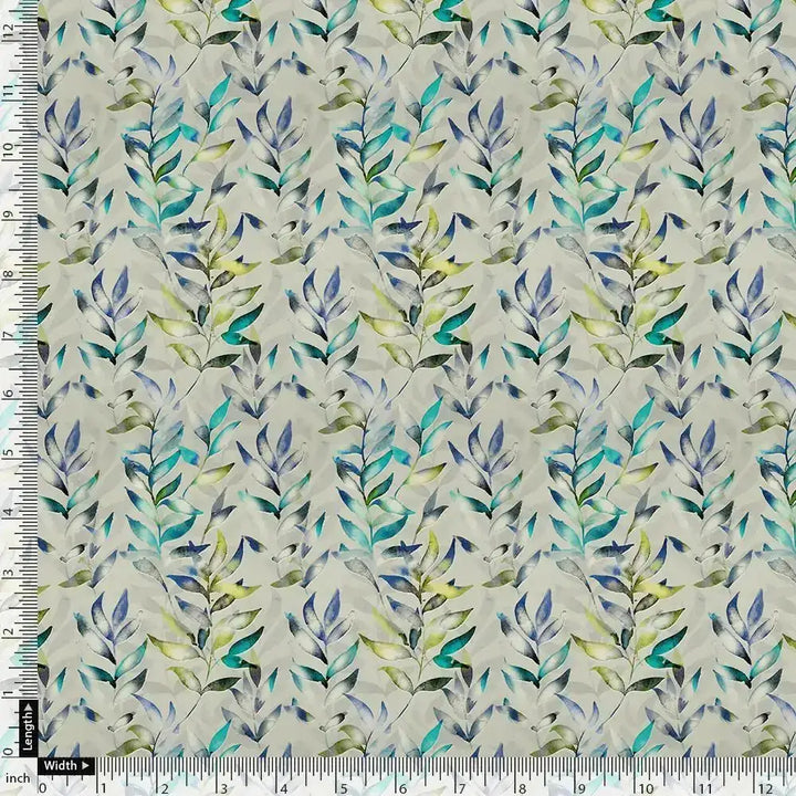 Green And Bluish Leaves Motif Digital Printed Fabric - Kora Silk