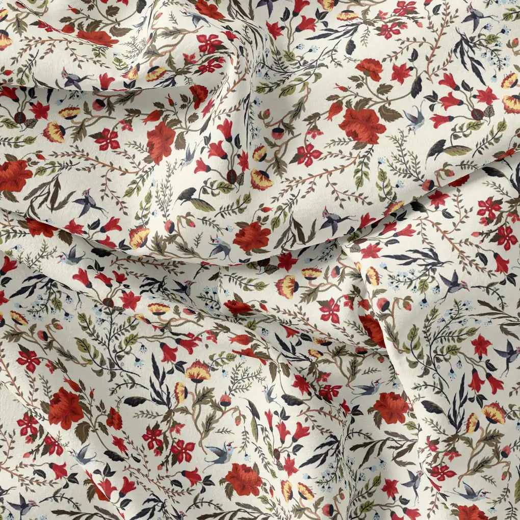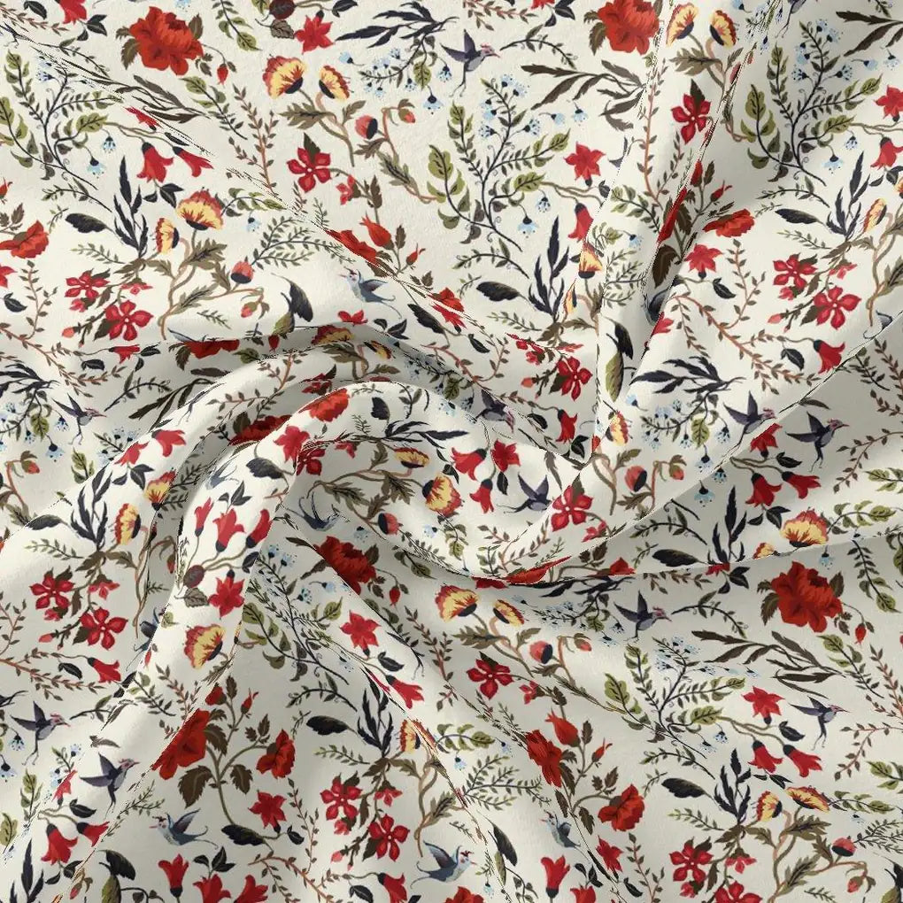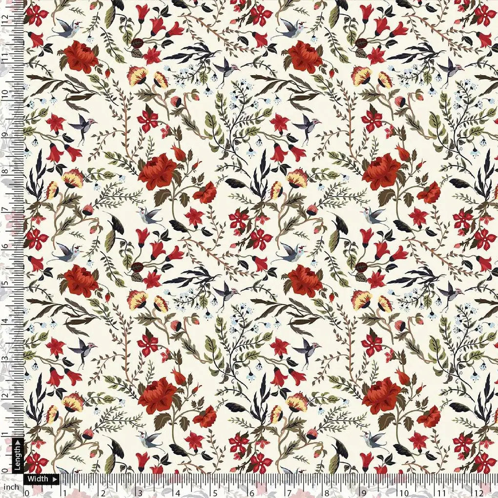 Jungle Wally Of Flower With Humming Bird Digital Printed Fabric - Japan Satin
