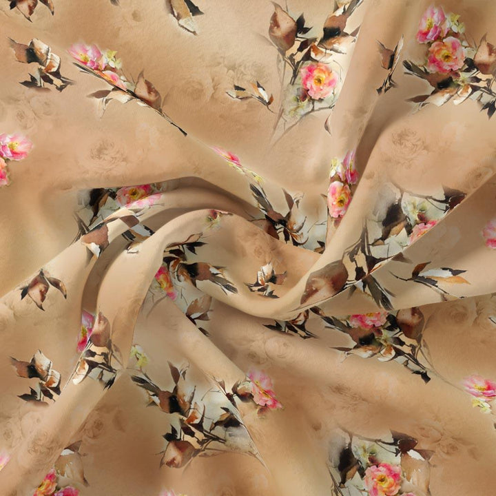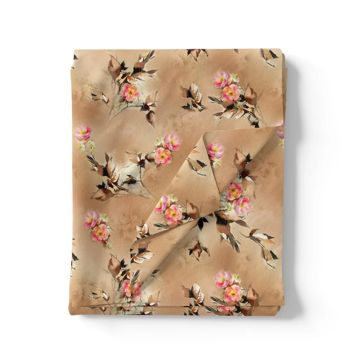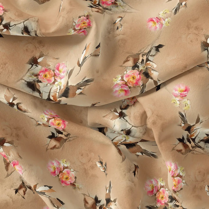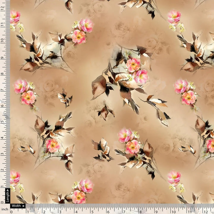 Morden Pink Rose And Leaves Flower Bunch Digital Printed Fabric - Pure Cotton