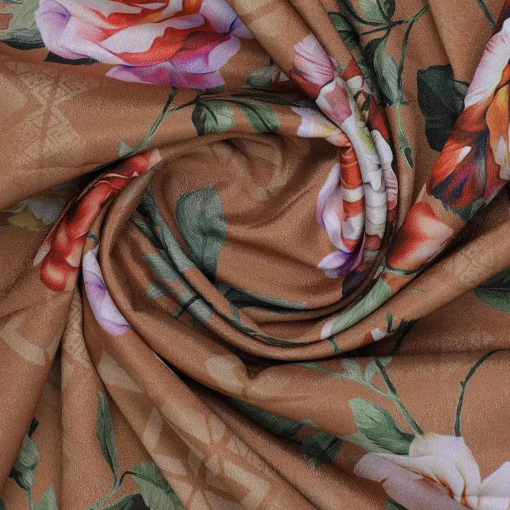 Oil Painted Flowers On Brown Digital Printed Fabric - Crepe – cr 0 ta05665p2 110 oil painted flowers on brown digital printed fabric crepe 1