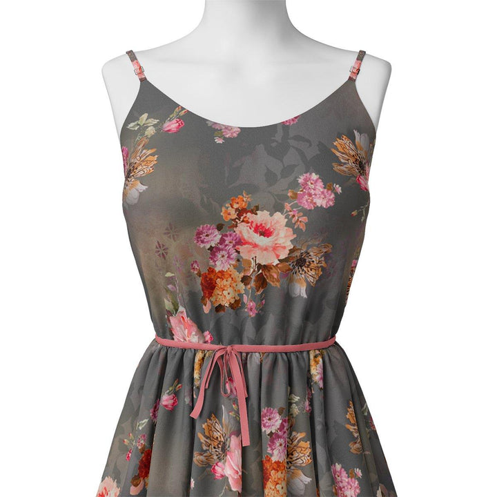 Painted Flower Bunch On Grey Palate Digital Printed Fabric - Kora Silk