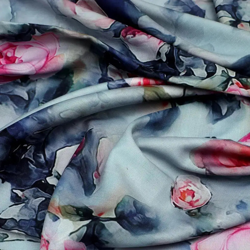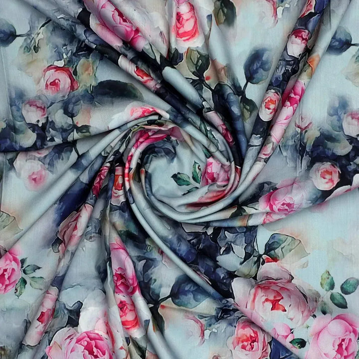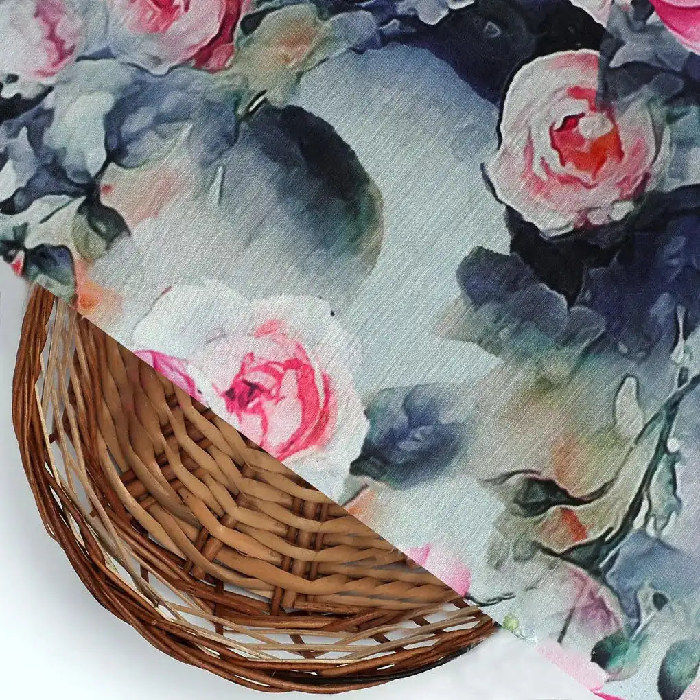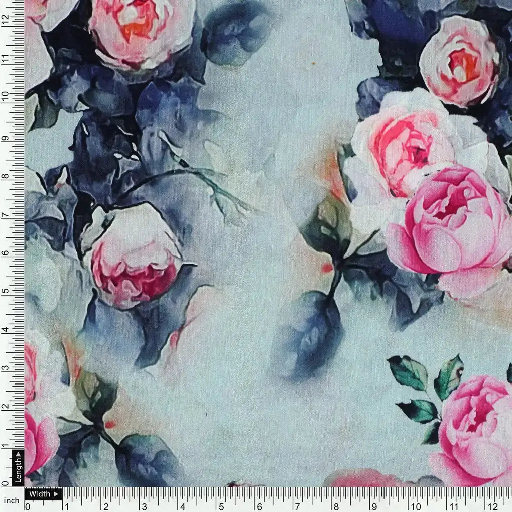 Pink And Peach Rose Allover Digital Printed Fabric - Kora Silk