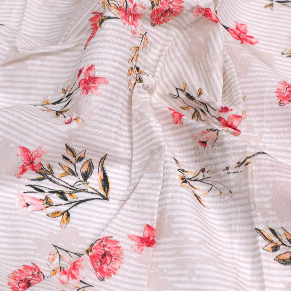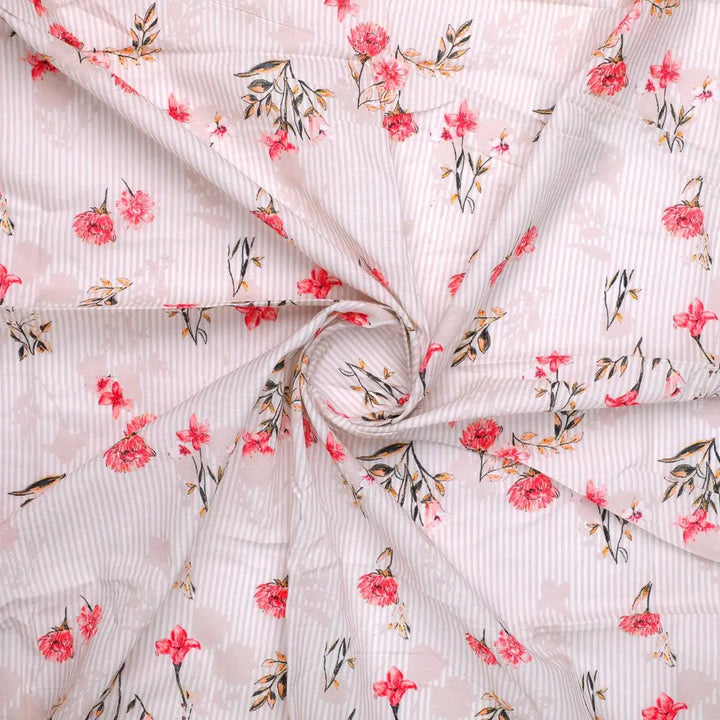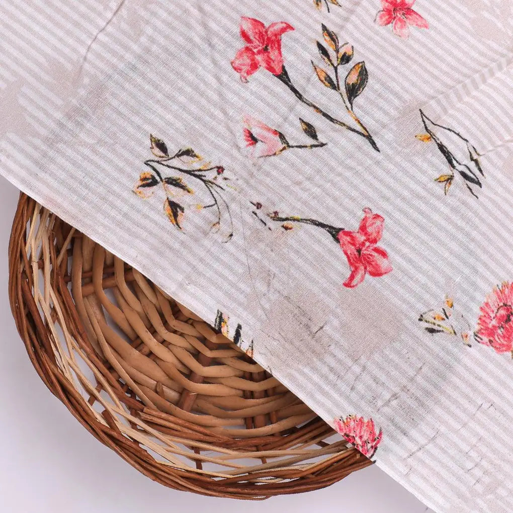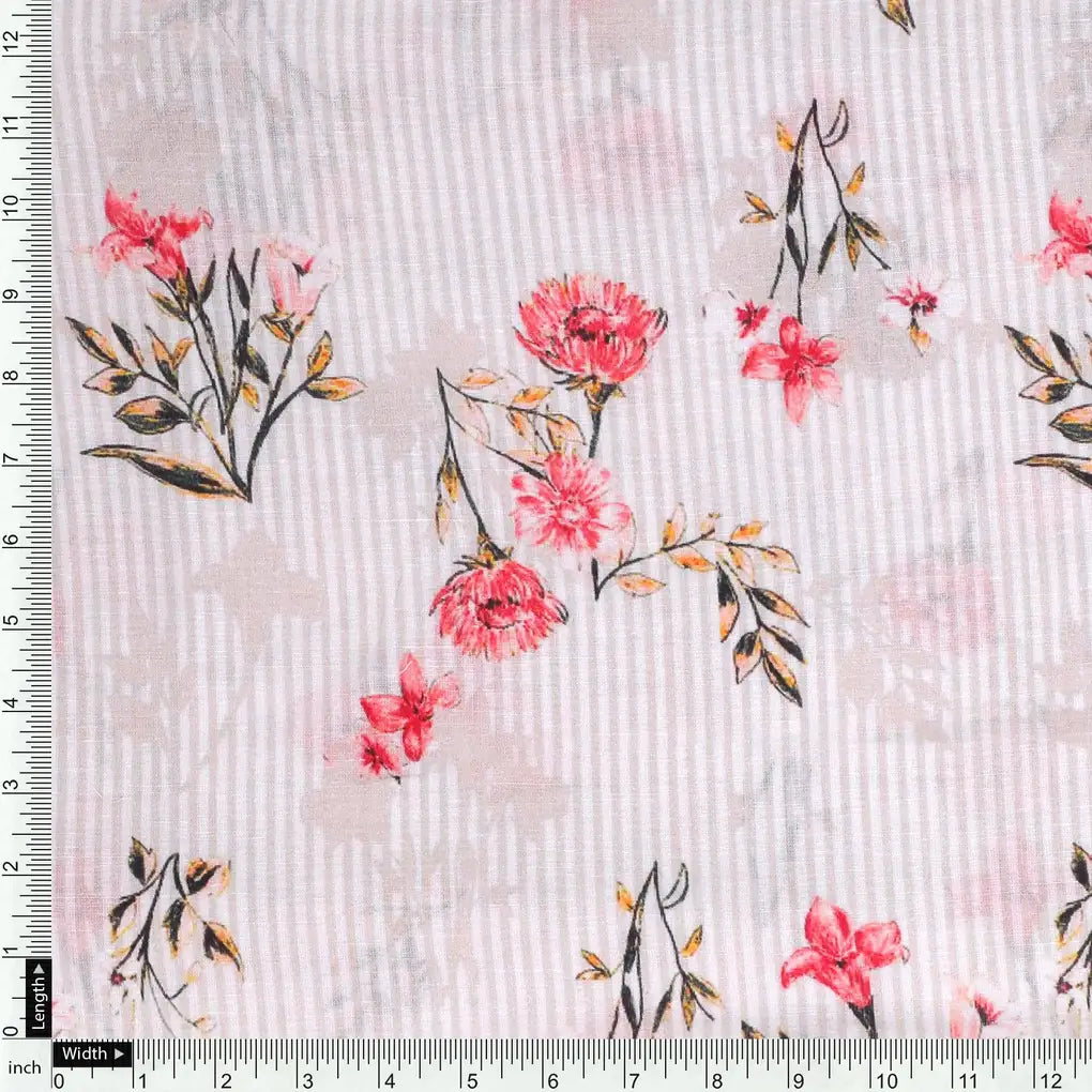 Pink Botanical Flower With Leaves Digital Printed Fabric - Pure Cotton