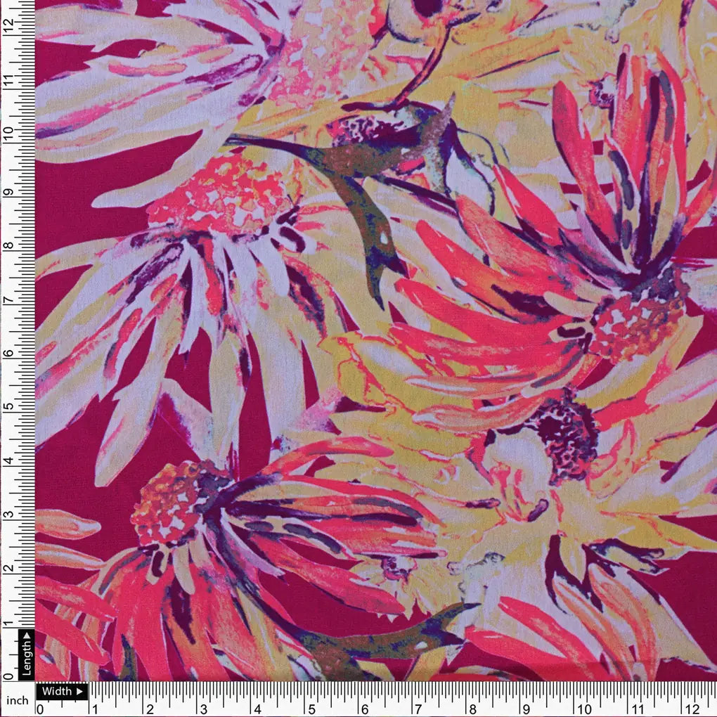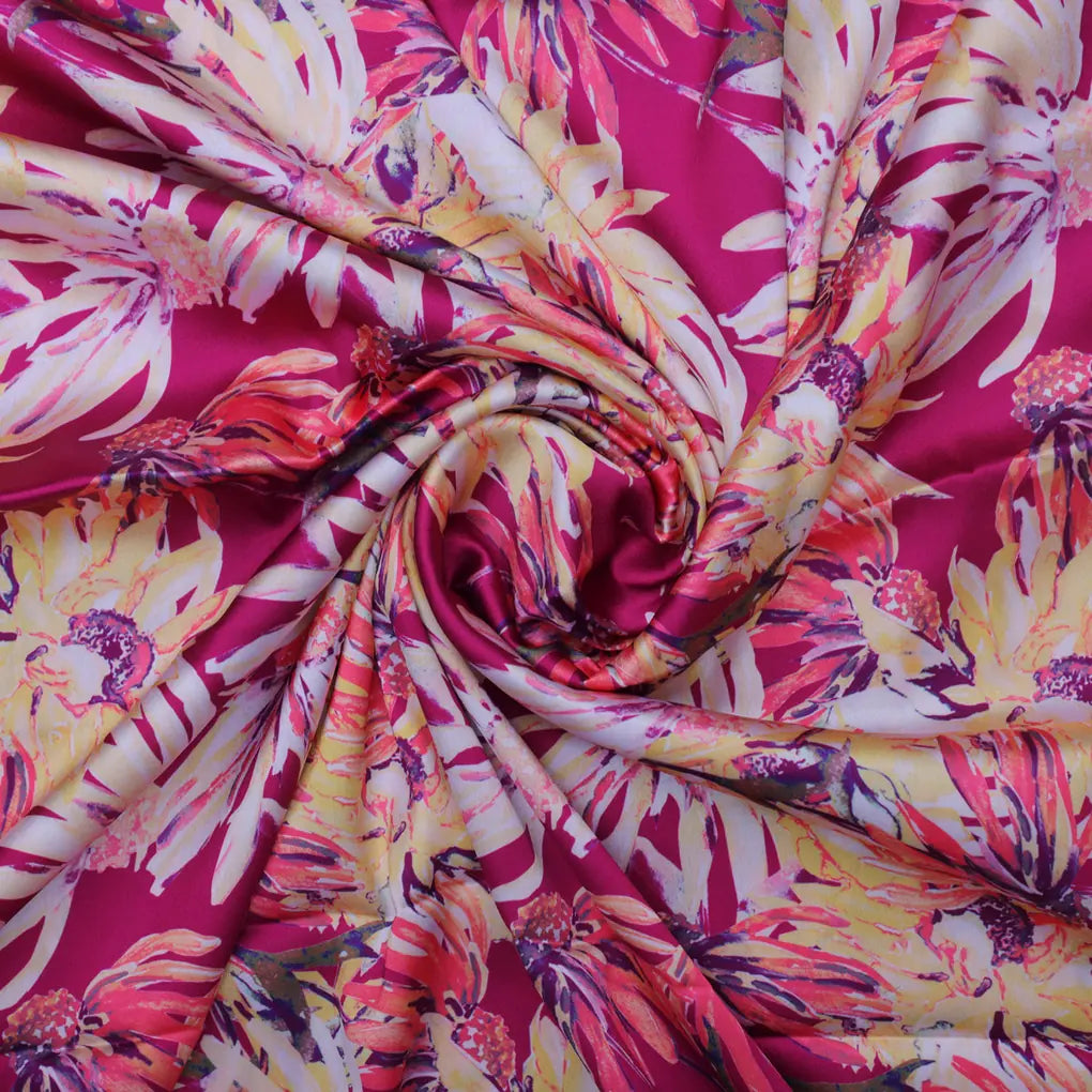 This pink multicolor floral printed japan satin fabric is perfect for creating a variety of garments and accessories. It is a lightweight, fluid fabric with a beautiful drape. The floral print is vibrant and eye catching, and the colors are perfect for spring and summer. This fabric is perfect for dresses, skirts, blouses, and pants. It can also be used for home decor projects, such as curtains, pillows, and tablecloths.