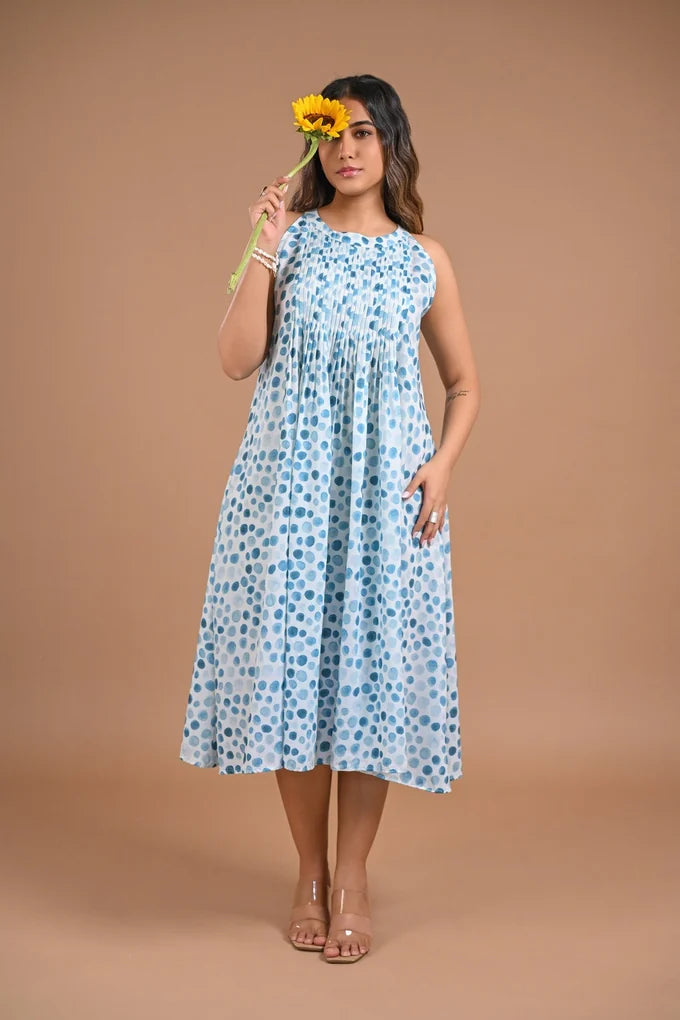 Pleated Blue Dot Midi Dress