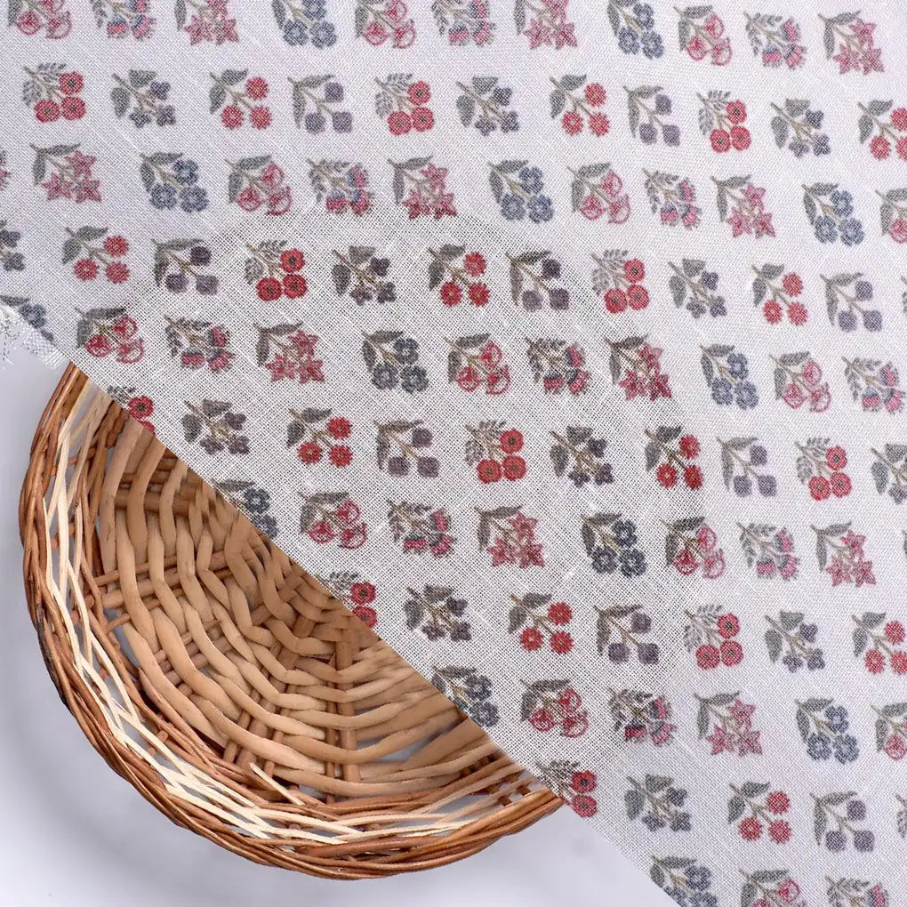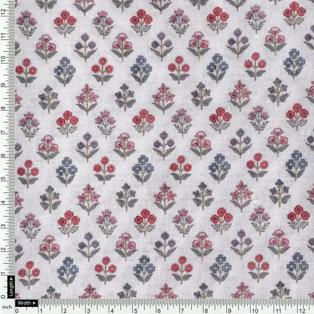Tiny Sunflower Blue With Red Digital Printed Fabric - Linen