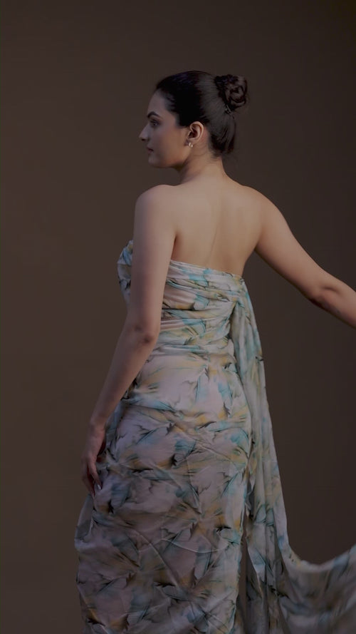 FAB VOGUE Studio presents this beautiful White Leaves Printed Pure Chiffon Fabric for Saree. This high-quality fabric is made from Bemberg Pure Chiffon and is digitally printed with a unique pattern of white leaves. It is perfect for making sarees and other clothing items.
