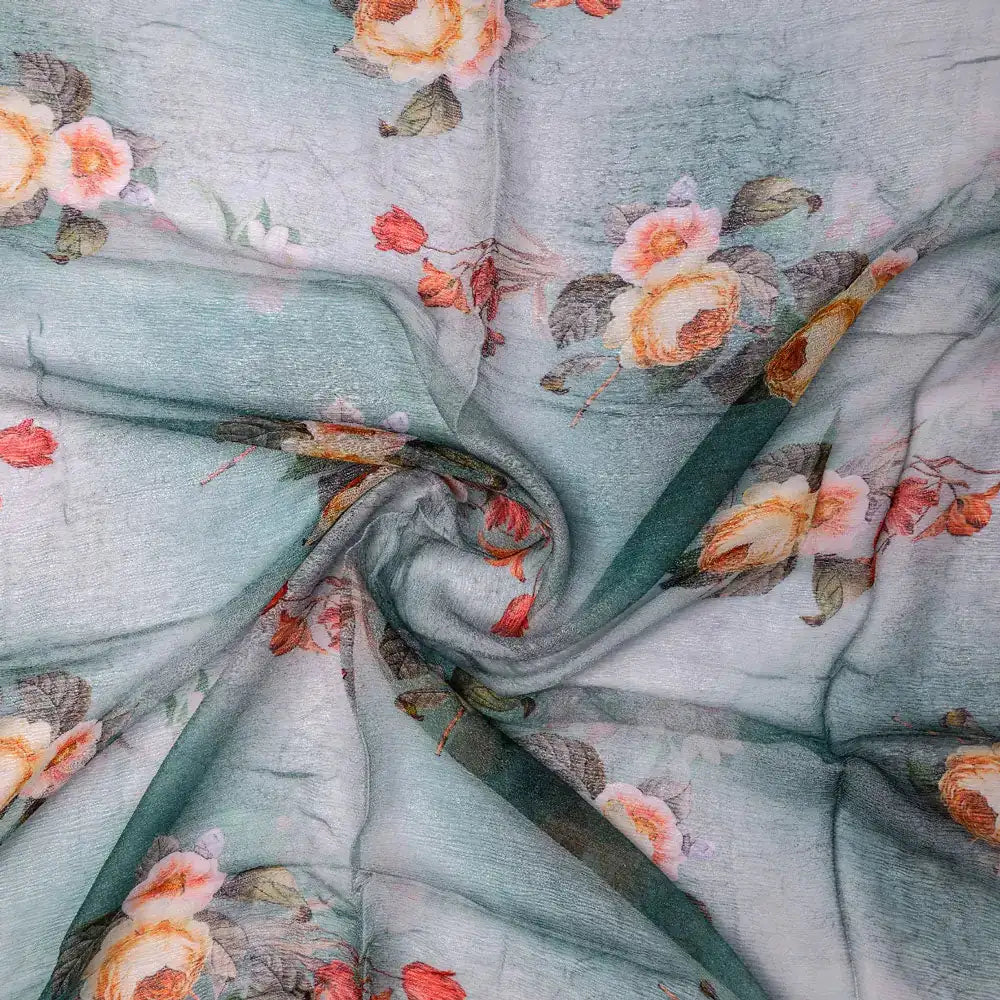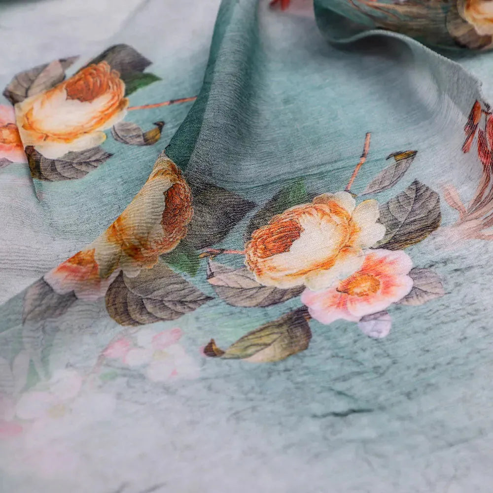 Looking for an attractive and unique fabric to add to your wardrobe? Look no further than this abstract digital printed pure chiffon fabric by FAB VOGUE Studio! This fabric is made from 100% pure chiffon and features a beautiful abstract design in green. It is perfect for making dresses, skirts, tops, and more. The fabric is also very lightweight and breathable, making it ideal for summer wear. Order yours today!
