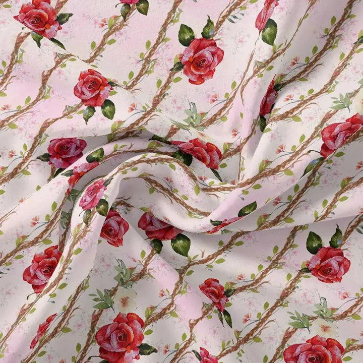 Introducing the Autumnal Red Roses With Leaves Weightless Digital Printed Fabric from FAB VOGUE Studio. The fabric is made from high-quality Polyester that is lightweight, making it perfect for creating beautiful garments that are comfortable to wear. The fabric features a vibrant green color and a beautiful floral pattern, perfect for adding a touch of elegance to any outfit. With this fabric, you can create a truly unique look that will make you stand out from the crowd. Create something special with the Autumnal Red Roses With Leaves Weightless Digital Printed Fabric from FAB VOGUE Studio.
